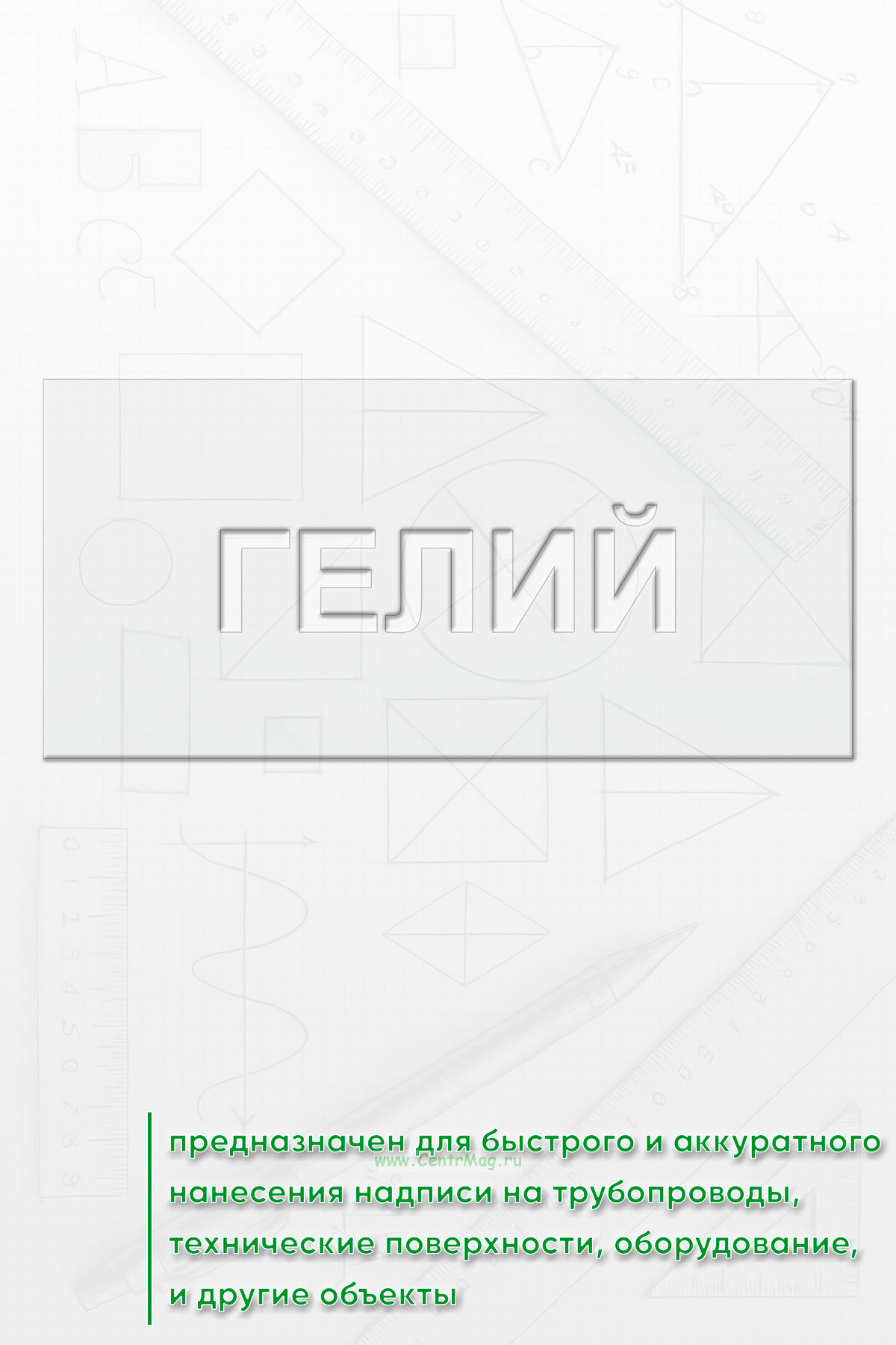Трафарет "Гелий" предназначен для быстрого и аккуратного нанесения надписи на трубопроводы, технические поверхности, оборудование, шкафы и другие объекты.