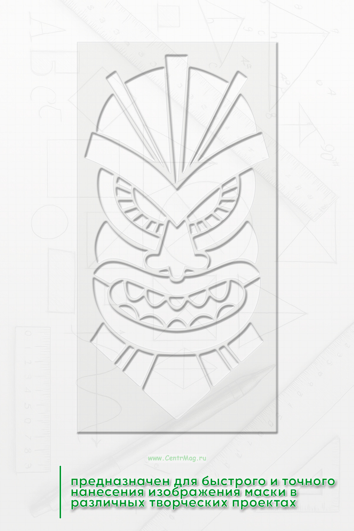 Трафарет "Грозный страж" предназначен для быстрого и точного нанесения изображения маски в различных творческих проектах. Он помогает создать эффект аутентичной древней маски, подчеркивая стиль и атмосферу исторического или фантастического образа.