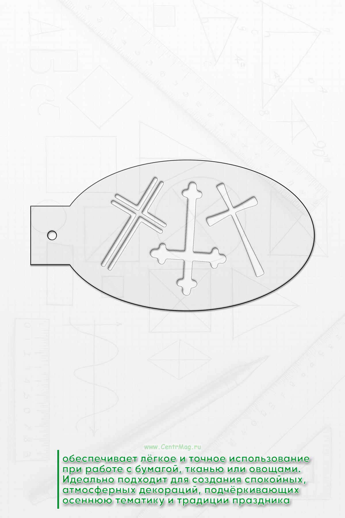 Трафарет проработан и вдохновлён традициями Хэллоуина. Удобная ручка на каждом трафарете обеспечивает лёгкое и точное использование при работе с бумагой, тканью или овощами. Идеально подходит для создания спокойных, атмосферных декораций, подчёркивающих осеннюю тематику и традиции праздника.
