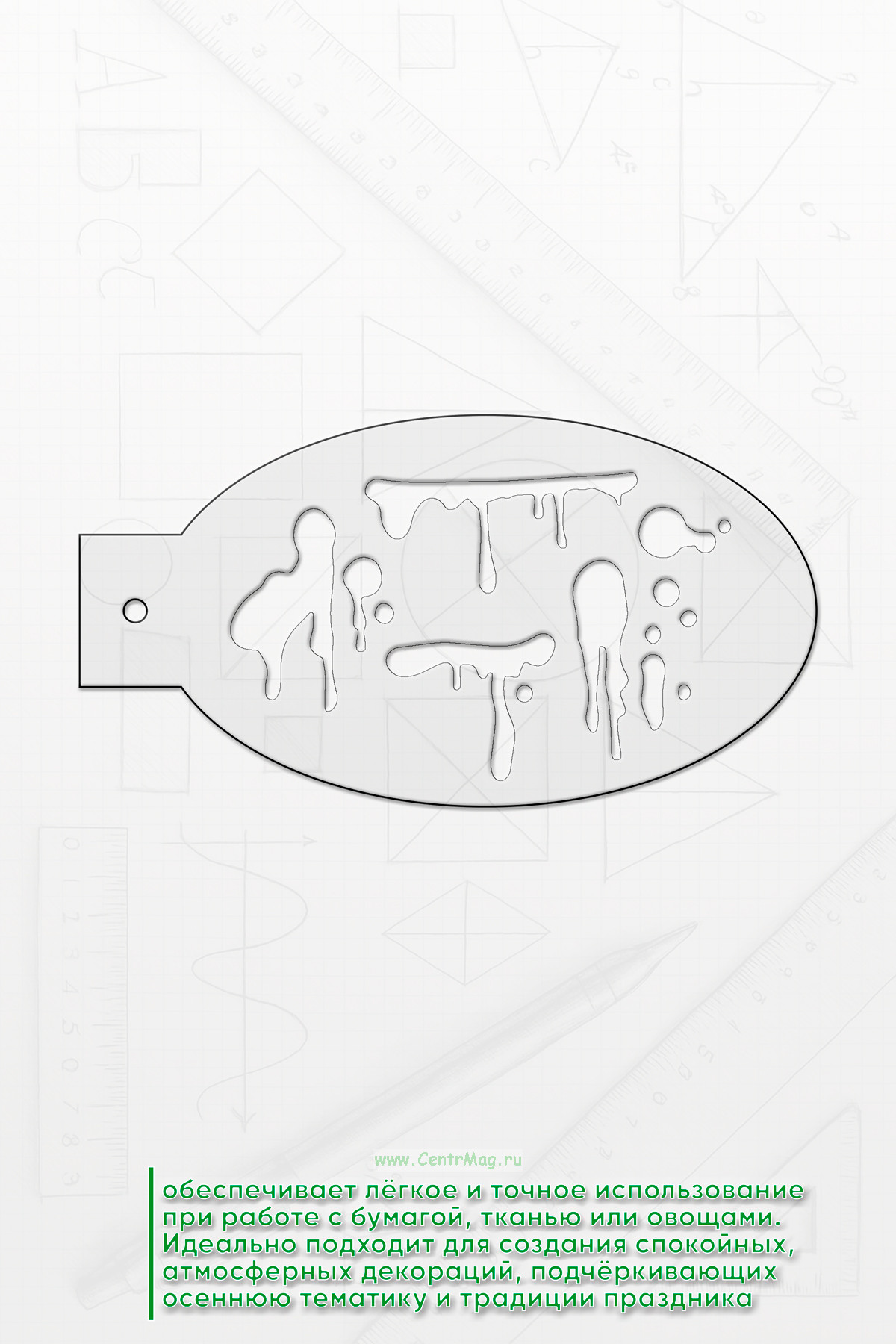 Трафарет проработан и вдохновлён традициями Хэллоуина. Удобная ручка на каждом трафарете обеспечивает лёгкое и точное использование при работе с бумагой, тканью или овощами. Идеально подходит для создания спокойных, атмосферных декораций, подчёркивающих осеннюю тематику и традиции праздника.