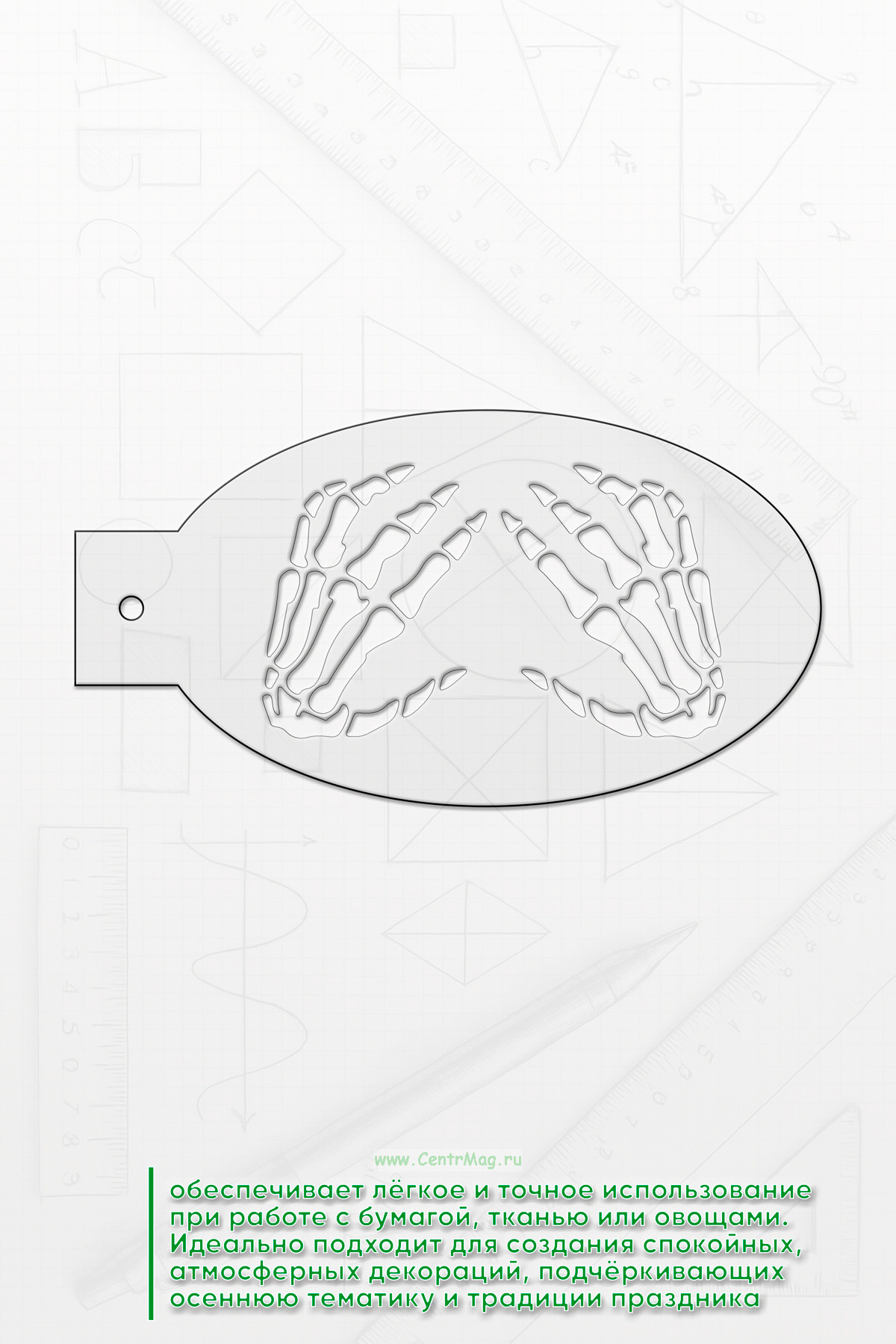 Трафарет проработан и вдохновлён традициями Хэллоуина. Удобная ручка на каждом трафарете обеспечивает лёгкое и точное использование при работе с бумагой, тканью или овощами. Идеально подходит для создания спокойных, атмосферных декораций, подчёркивающих осеннюю тематику и традиции праздника.