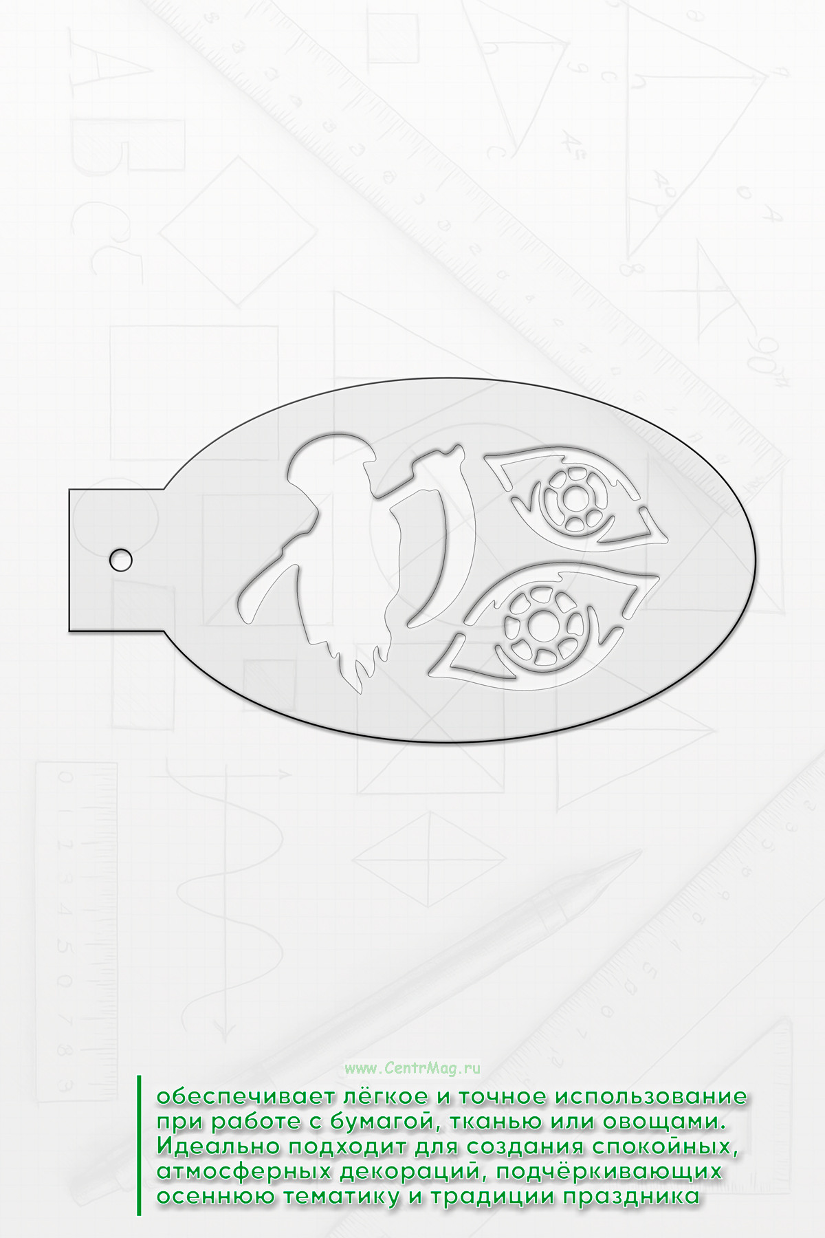 Трафарет проработан и вдохновлён традициями Хэллоуина. Удобная ручка на каждом трафарете обеспечивает лёгкое и точное использование при работе с бумагой, тканью или овощами. Идеально подходит для создания спокойных, атмосферных декораций, подчёркивающих осеннюю тематику и традиции праздника.
