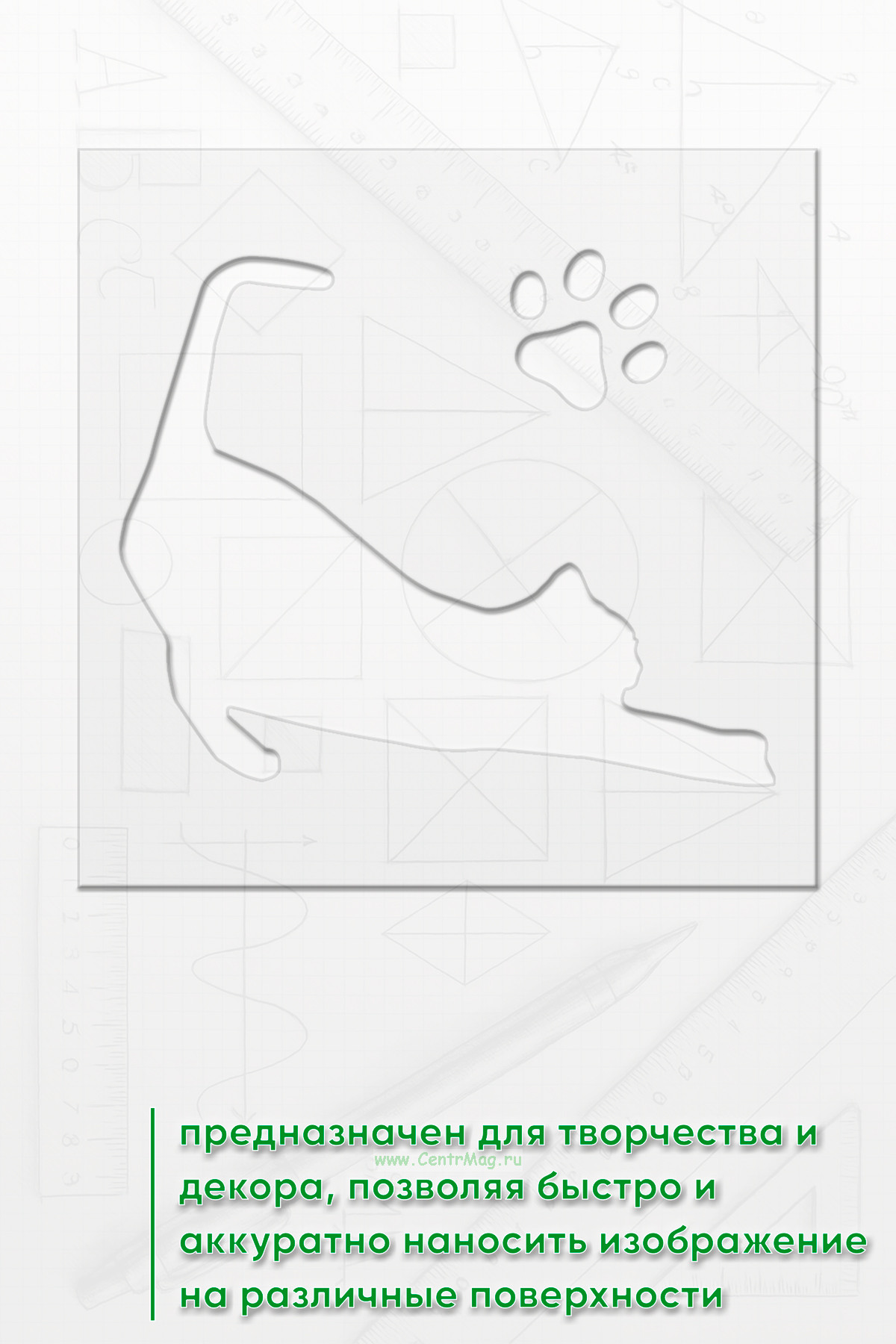 Трафарет предназначен для творчества и декора, позволяя быстро и аккуратно наносить изображение на различные поверхности. Подходит для создания декора на одежде, мебели, стенах, оформления блокнотов и открыток, а также для тематических плакатов и постеров.