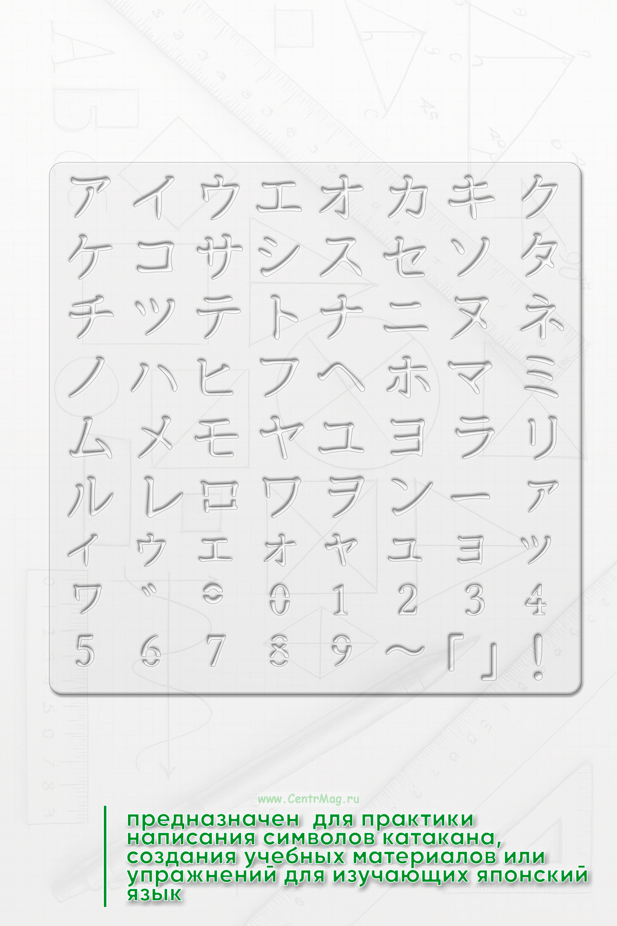 Трафарет "Катакана" предназначен для практики написания символов катакана, создания учебных материалов или упражнений для изучающих японский язык.