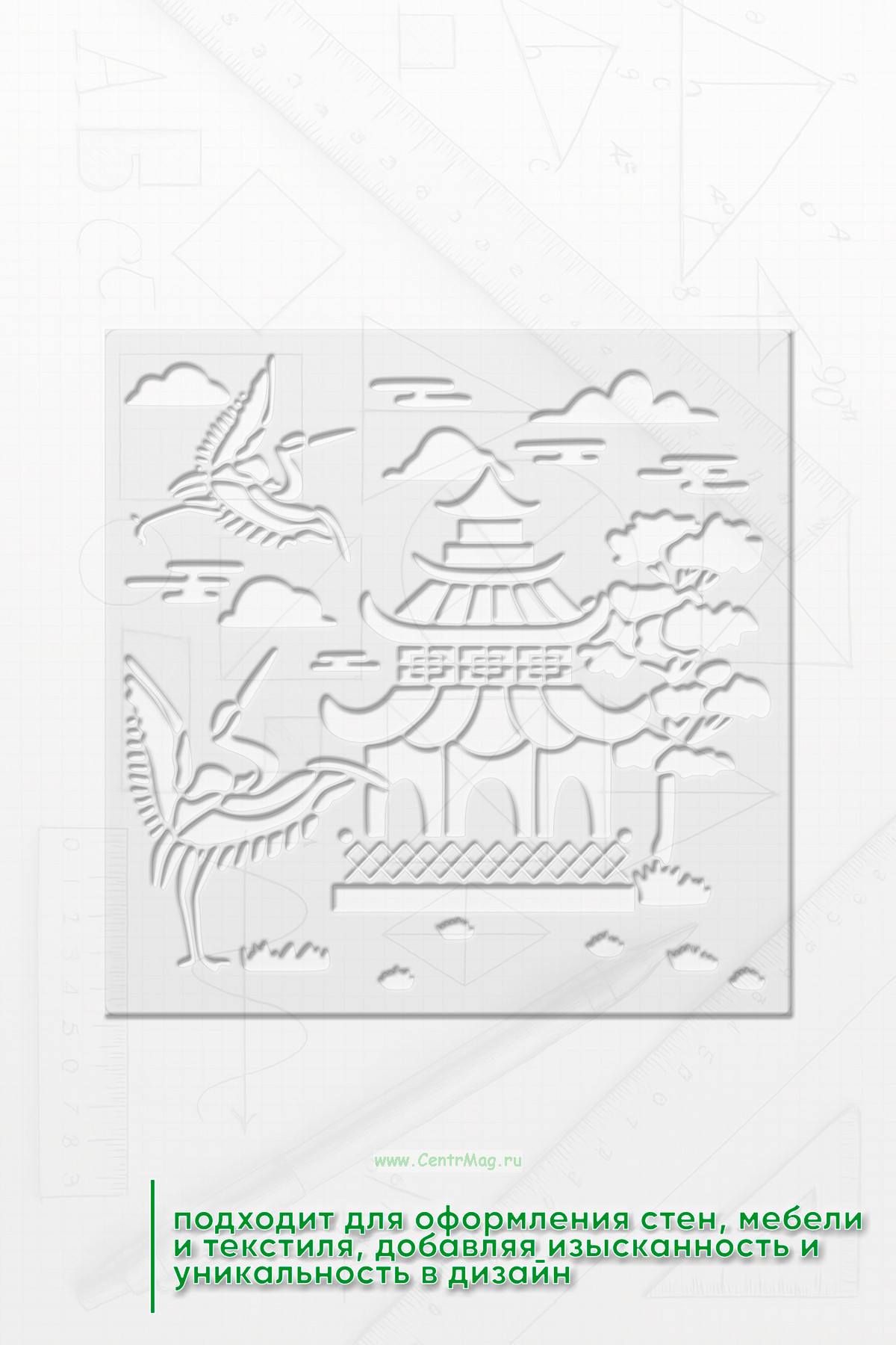 Трафарет "Восточная гармония" используется для создания декоративных элементов в интерьере, придавая пространству атмосферу восточной эстетики. Он подходит для оформления стен, мебели и текстиля, добавляя изысканность и уникальность в дизайн.