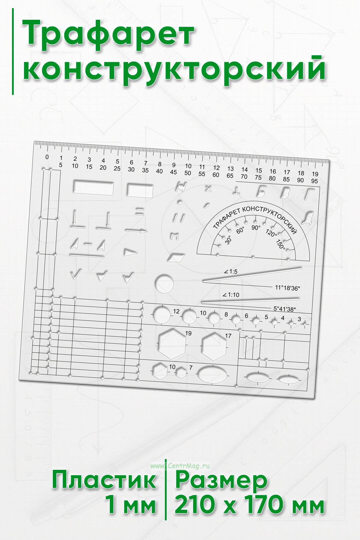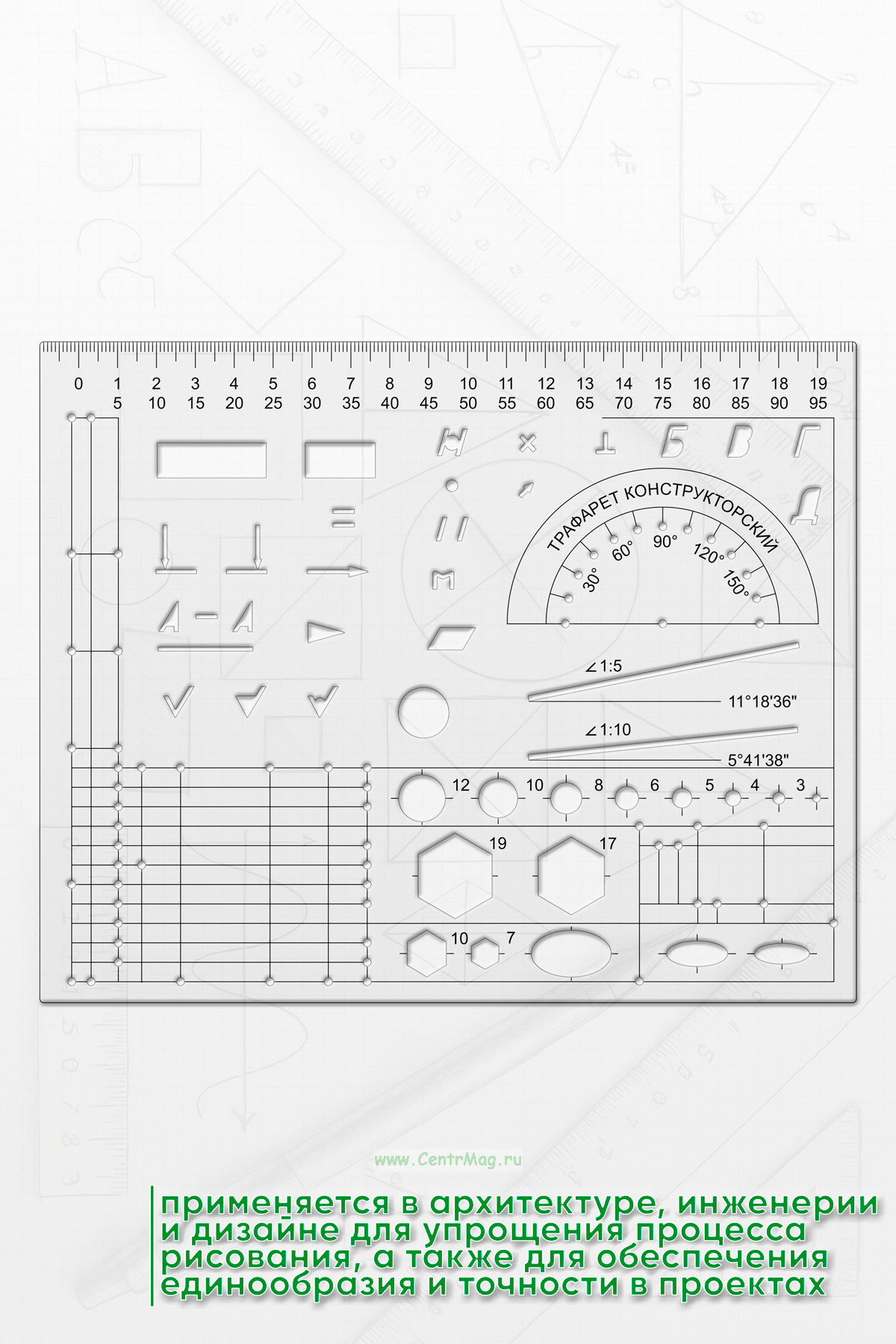 Трафарет конструкторский — это инструмент, используемый в проектировании и черчении для создания точных и аккуратных изображений, форм и элементов. Трафарет часто применяются в архитектуре, инженерии и дизайне для упрощения процесса рисования, а также для обеспечения единообразия и точности в проектах
