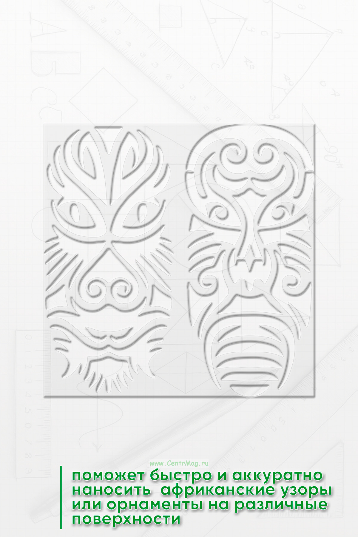 Трафарет "Лики предков" обычно используется для создания декоративных узоров, рисунков или элементов в художественной, дизайнерской, или декоративной деятельности. Поможет быстро и аккуратно наносить характерные африканские узоры, мотивы или орнаменты на различные поверхности, такие как стены, ткани, бумага или другие материалы.
