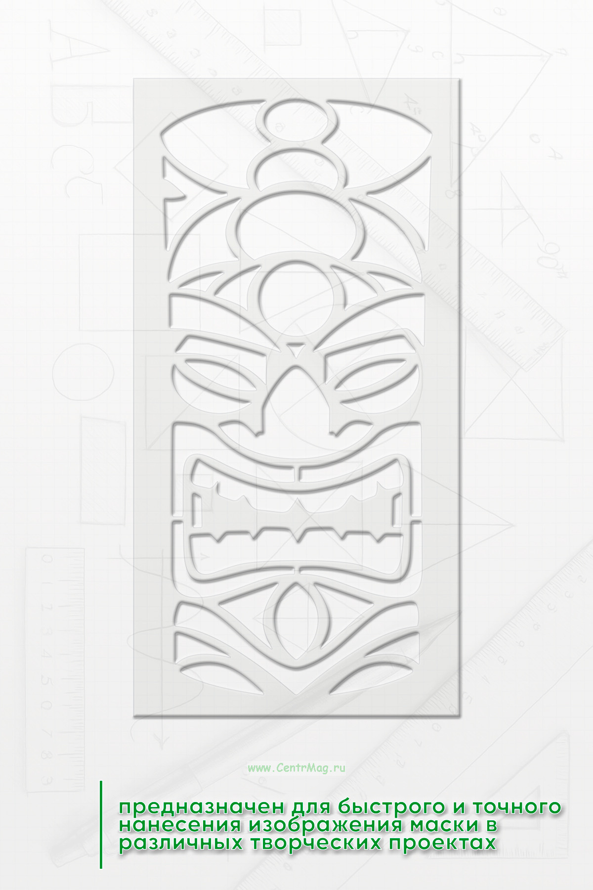 Трафарет "Маска древнего воина" предназначен для быстрого и точного нанесения изображения маски в различных творческих проектах. Он помогает создать эффект аутентичной древней маски, подчеркивая стиль и атмосферу исторического или фантастического образа.