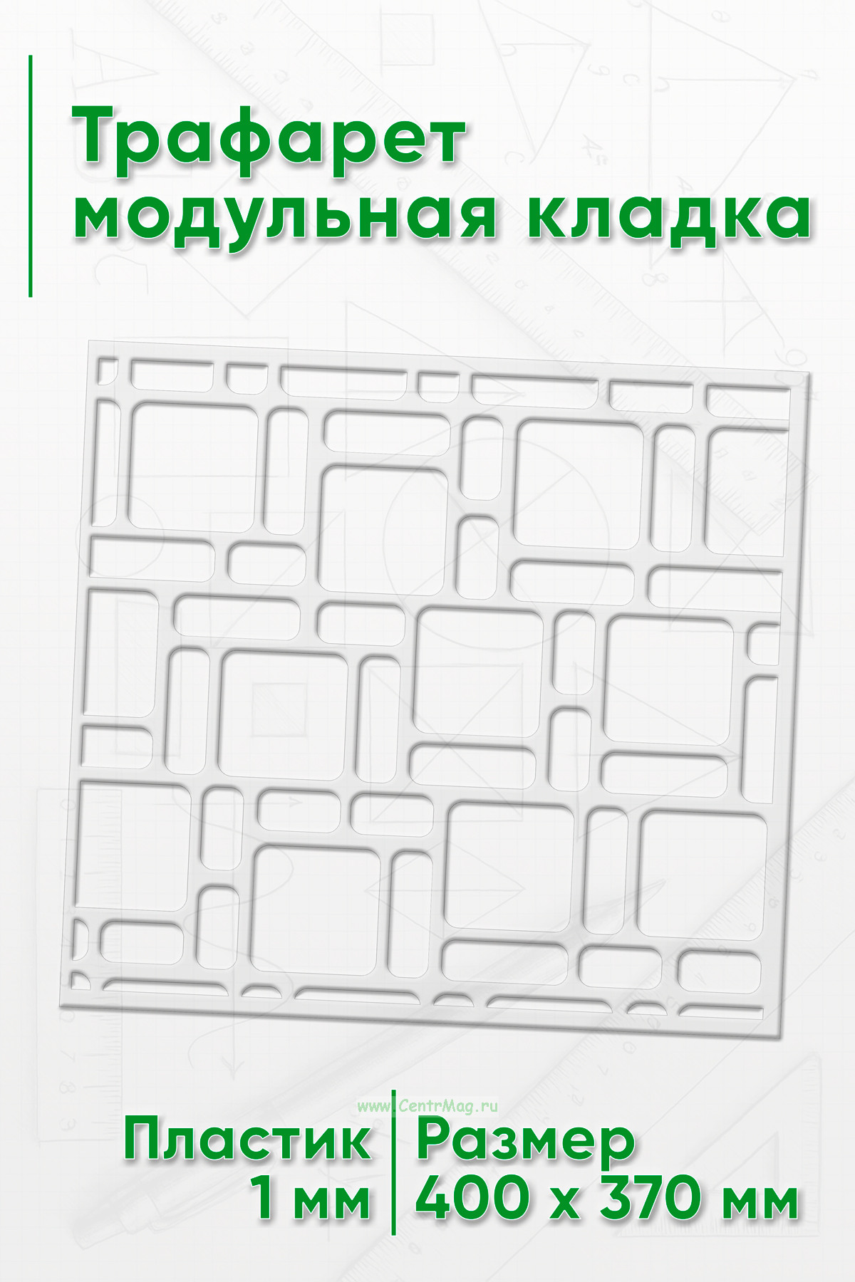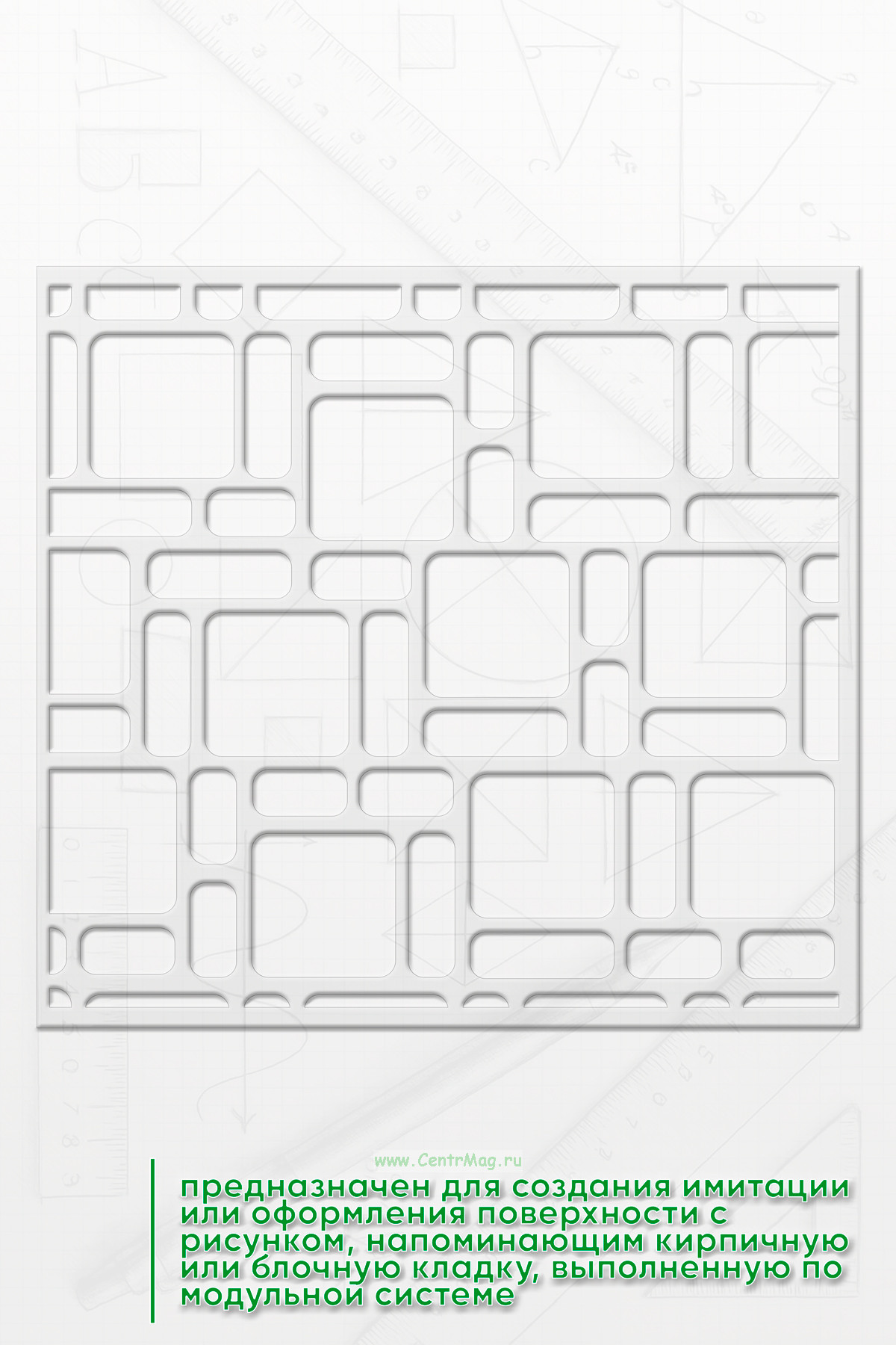Трафарет «Модульная кладка» предназначен для создания имитации или оформления поверхности с рисунком, напоминающим кирпичную или блочную кладку, выполненную по модульной системе.