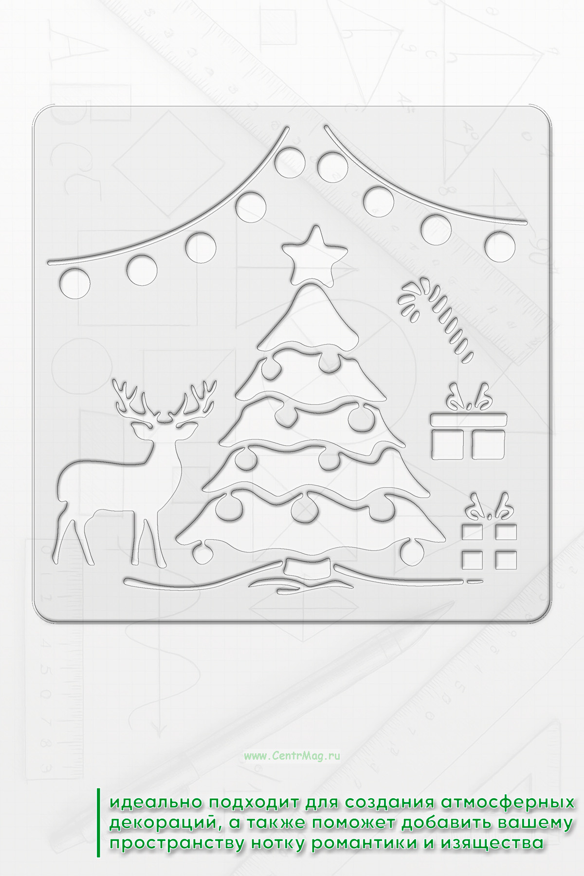Трафарет поможет создать красивый и оригинальный узор. Идеально подходит для тех, кто хочет добавить индивидуальности своему творчеству в Новогодние праздники. Можно использовать для украшения открыток, альбомов, коробок, шкатулок, предметов мебели и даже интерьера