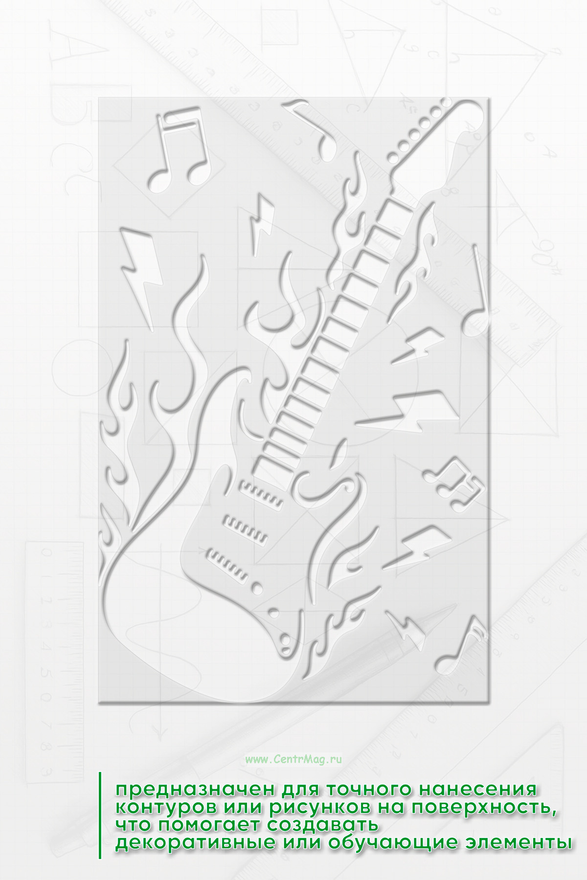 Трафарет предназначен для легкого и точного нанесения контуров или рисунков на поверхность, что помогает создавать декоративные или обучающие элементы. Он используется как в художественных, так и в образовательных целях, а также при изготовлении украшений или аксессуаров с гитарной тематикой.