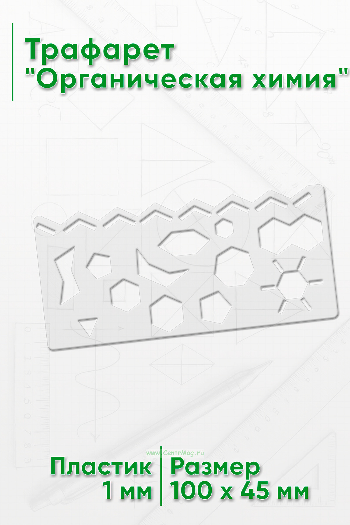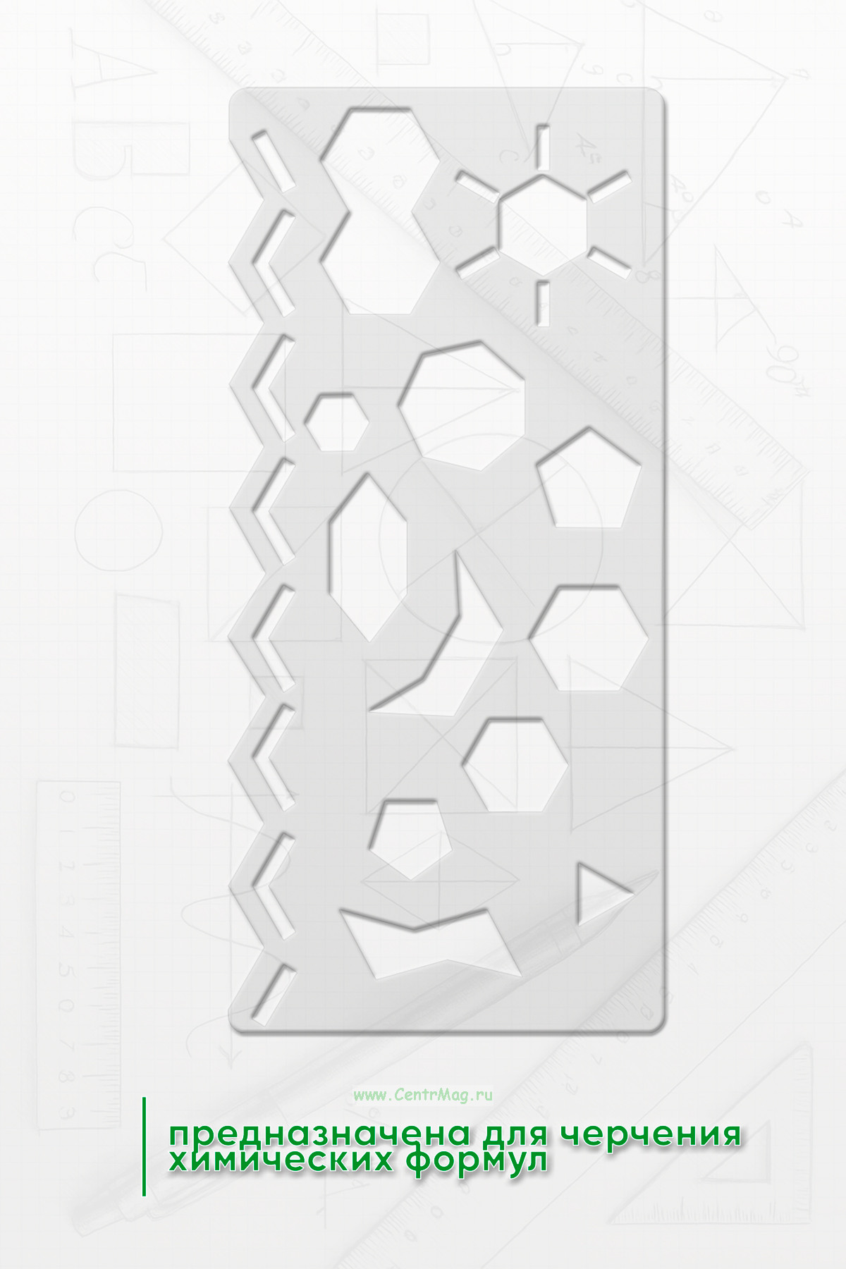 Линейка-трафарет предназначена для черчения химических формул. Полезна при изучении органической химии и молекулярной биологии
