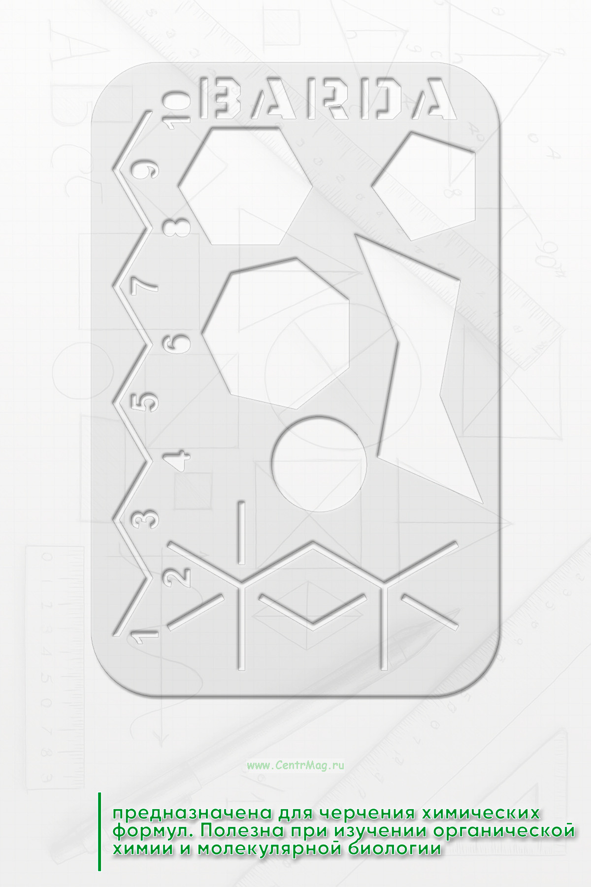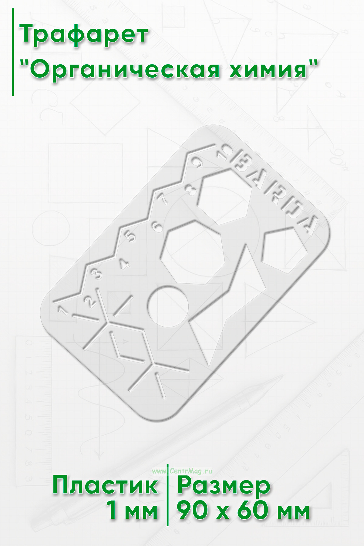 Линейка-трафарет предназначена для черчения химических формул. Полезна при изучении органической химии и молекулярной биологии