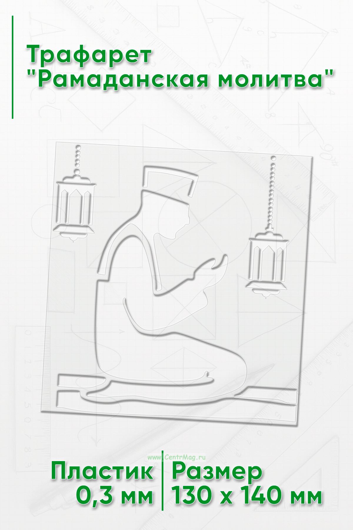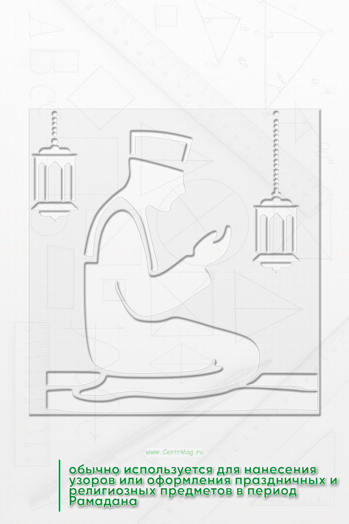 Трафарет с изображением или надписью "Рамаданская молитва" обычно используется для нанесения узоров или оформления праздничных и религиозных предметов в период Рамадана. Его предназначение — помочь создать красивое и точное украшение или надпись, связанное с мусульманским постом и молитвой во время этого священного месяца.