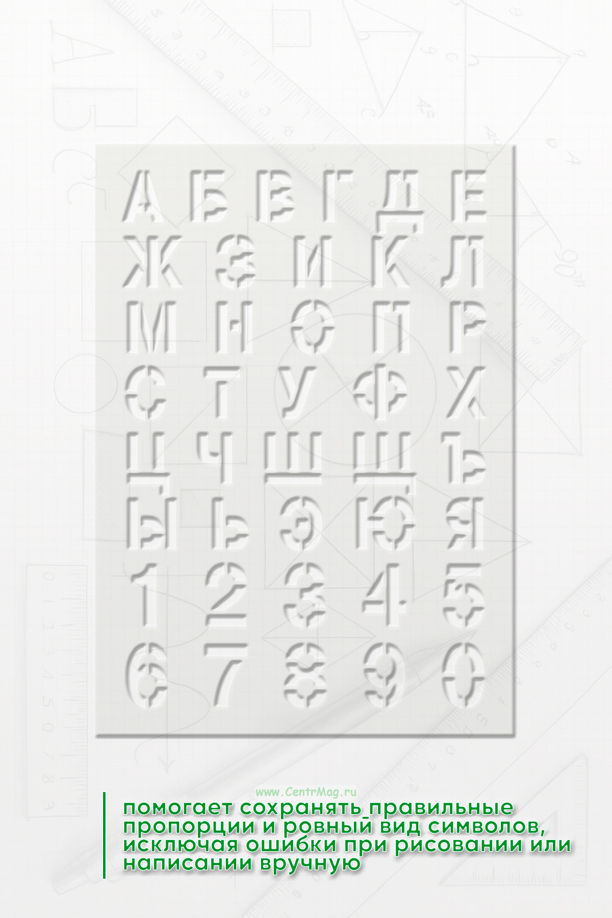 Трафарет «Русский алфавит и Цифры» предназначен для удобного и аккуратного нанесения букв русского алфавита и цифровых символов на различные поверхности.