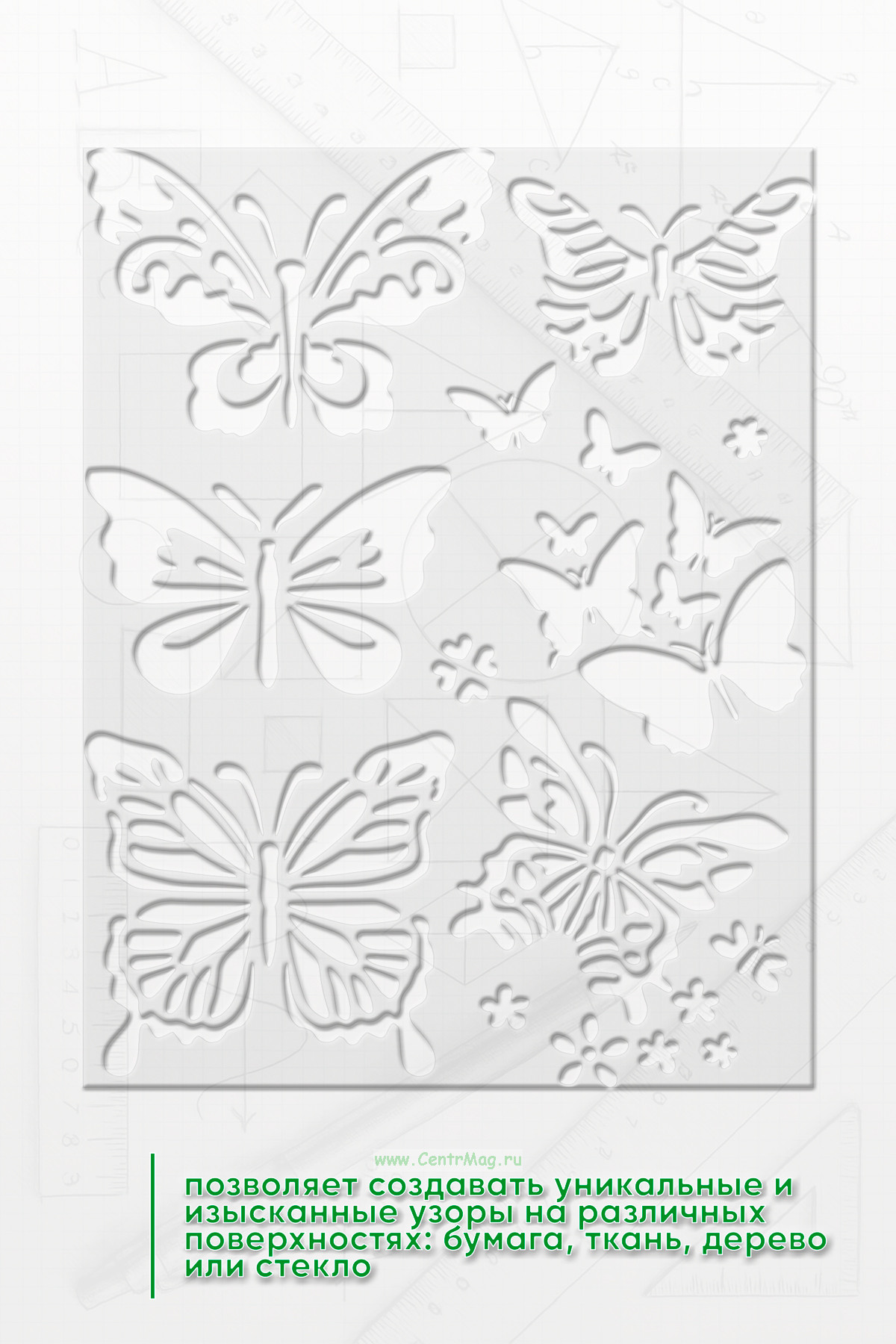 Трафарет — это отличный инструмент для творчества и декорирования. Трафареты позволяют создавать уникальные и изысканные узоры на различных поверхностях: бумага, ткань, дерево или стекло. Возможно использовать для декорирования страниц, обложек в скрапбукинге, готовых изделий в технике декупаж, упаковок, открыток, альбомов