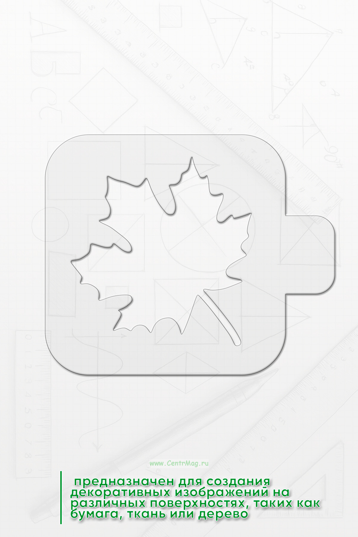 Трафарет с ручкой "Кленовый лист" предназначен для создания декоративных изображений кленового листа на различных поверхностях, таких как бумага, ткань или дерево. Он идеально подходит для украшения, рукоделия и художественных проектов, связанных с природой и осенней тематикой.