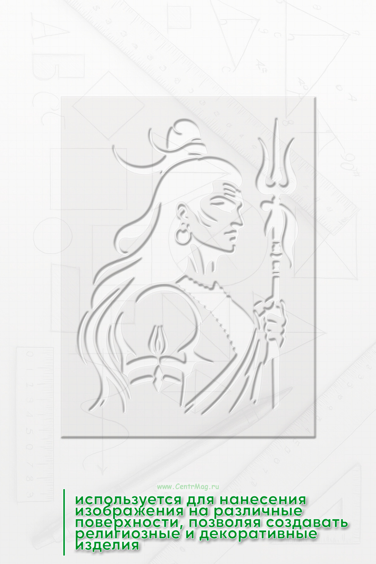 Трафарет "Шива" используется для нанесения изображения бога Шивы на различные поверхности, позволяя создавать религиозные и декоративные изделия. Его предназначение — создание художественных или эзотерических украшений и предметов.