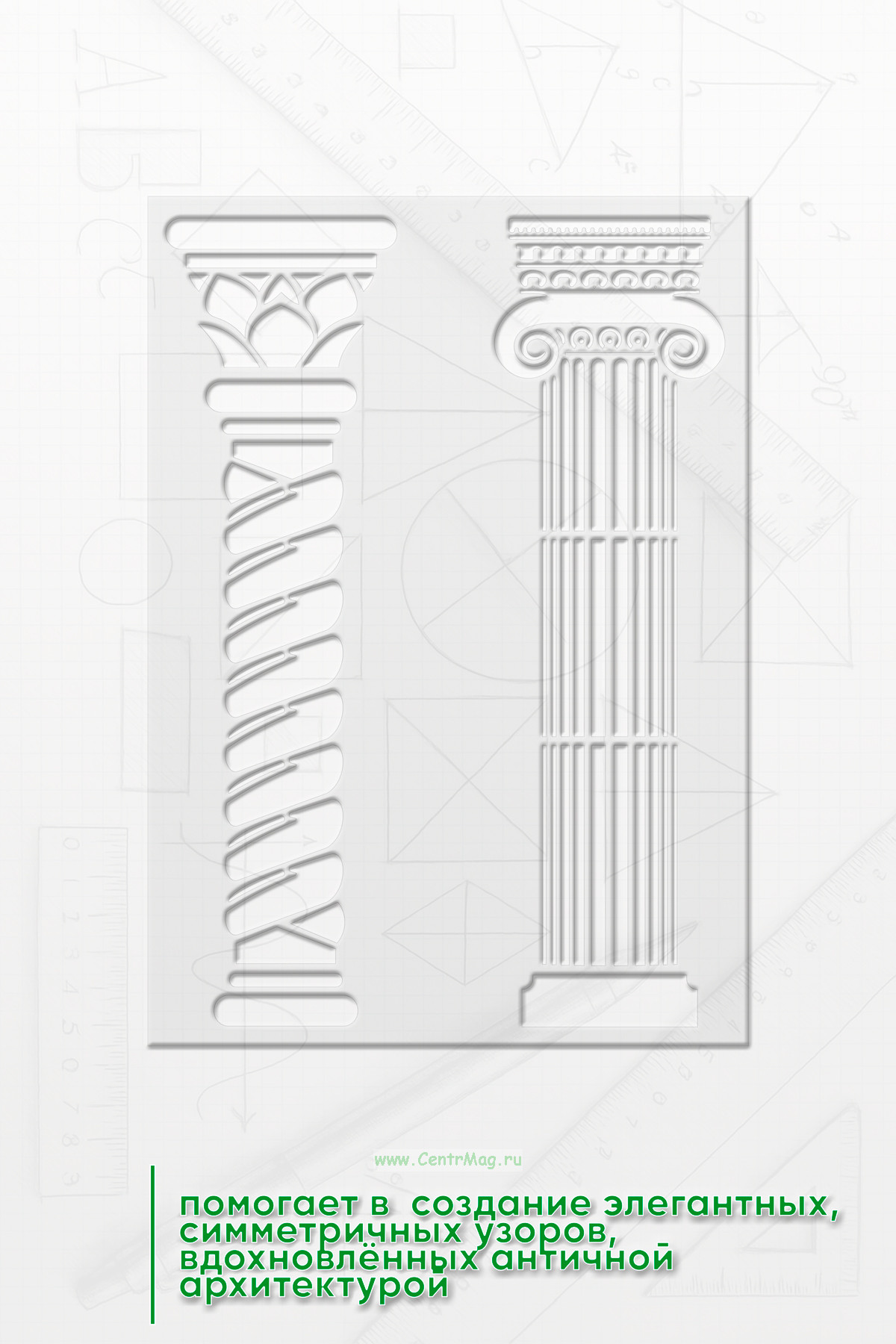 Трафарет "Симфония Античных Форм" помогает в создание элегантных, симметричных узоров, вдохновлённых античной архитектурой.