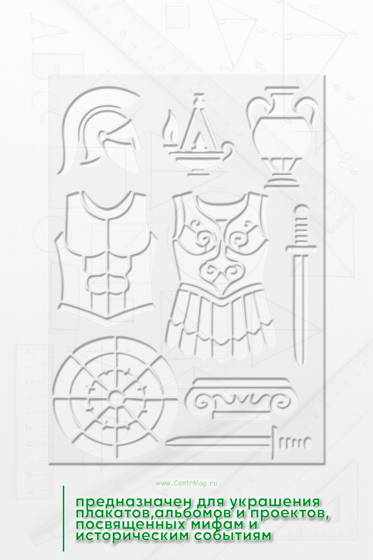 Трафарет "Вдохновение Мифов" предназначен для украшения плакатов, альбомов и проектов, посвящённых мифам и историческим событиям древних цивилизаций. Он помогает визуально подчеркнуть тему древних легенд и придает работе атмосферу таинственности и исторической глубины.