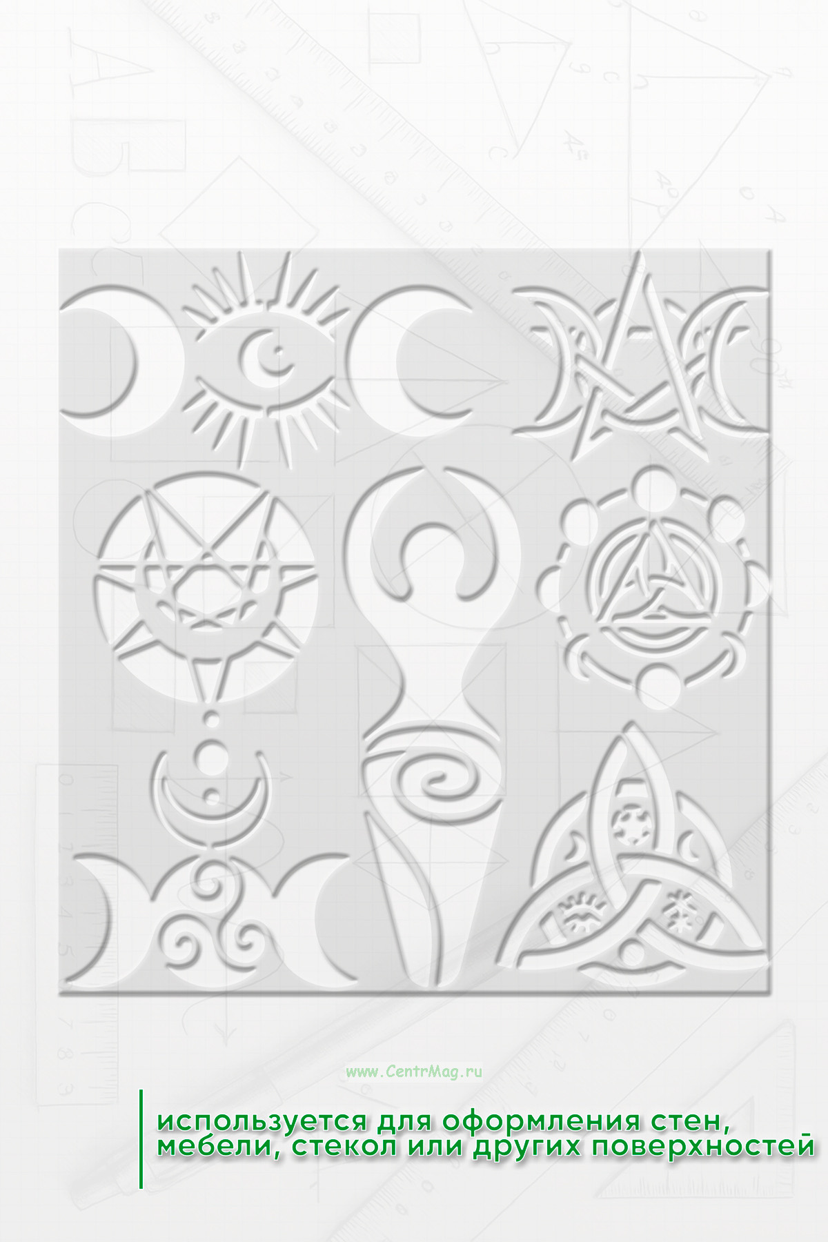 Трафарет предназначен для создания декоративных изображений, связанных с мистикой, оккультизмом, эзотерикой и предсказаниями.