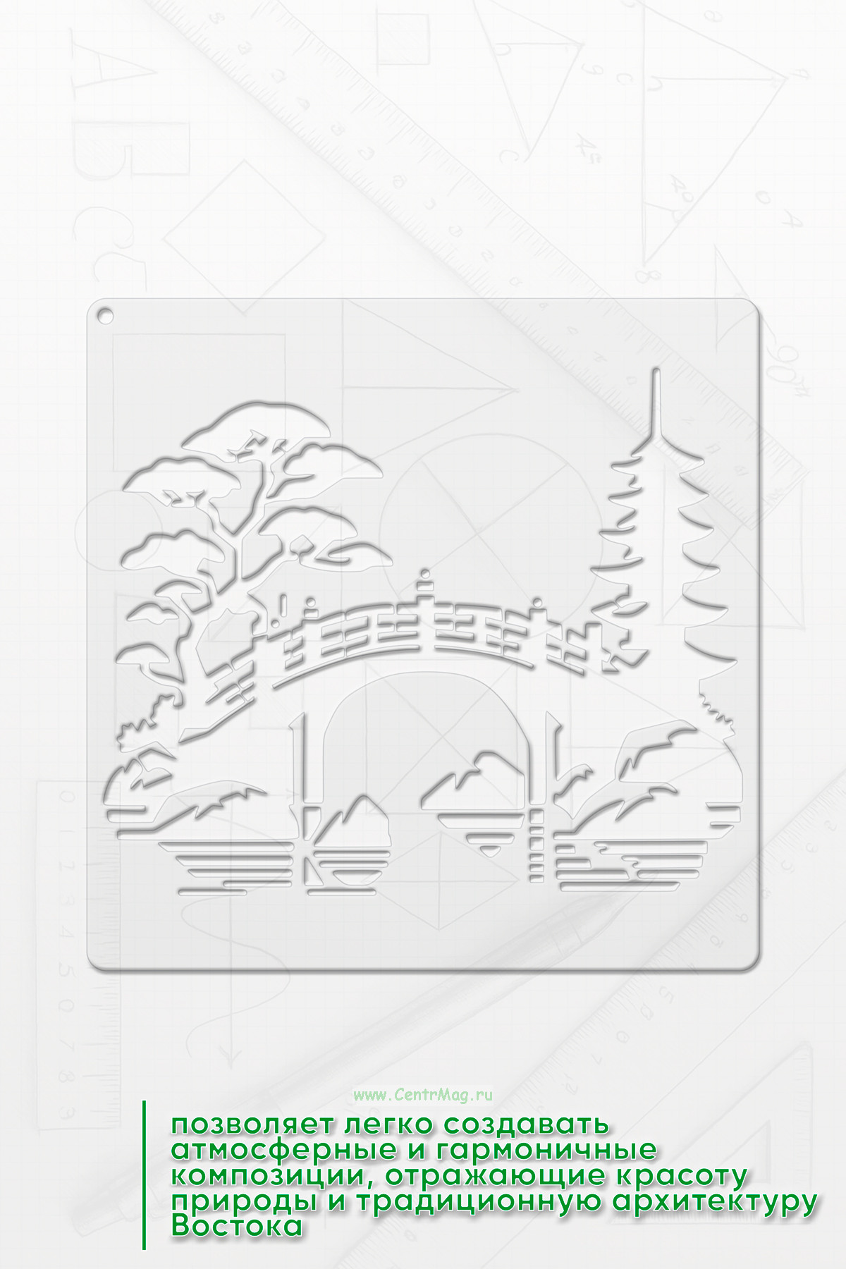 Трафарет "Сказочный Пейзаж" позволяет легко создавать атмосферные и гармоничные композиции, отражающие красоту природы и традиционную архитектуру Востока. Он идеально подходит для художников и любителей, желающих добавить восточный акцент в свои работы, упрощая процесс нанесения деталей и форм.