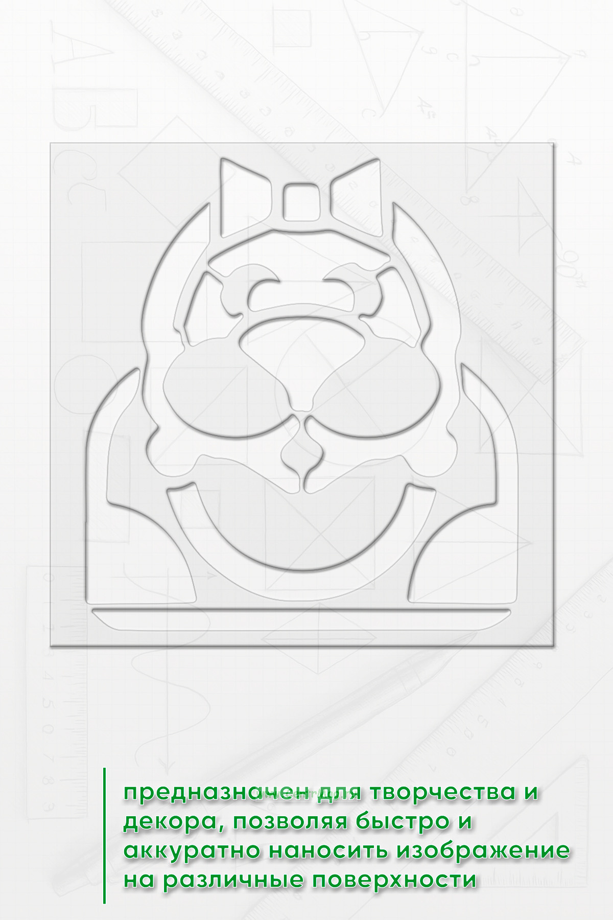 Трафарет предназначен для творчества и декора, позволяя быстро и аккуратно наносить изображение на различные поверхности. Подходит для создания декора на одежде, мебели, стенах, оформления блокнотов и открыток, а также для тематических плакатов и постеров.
