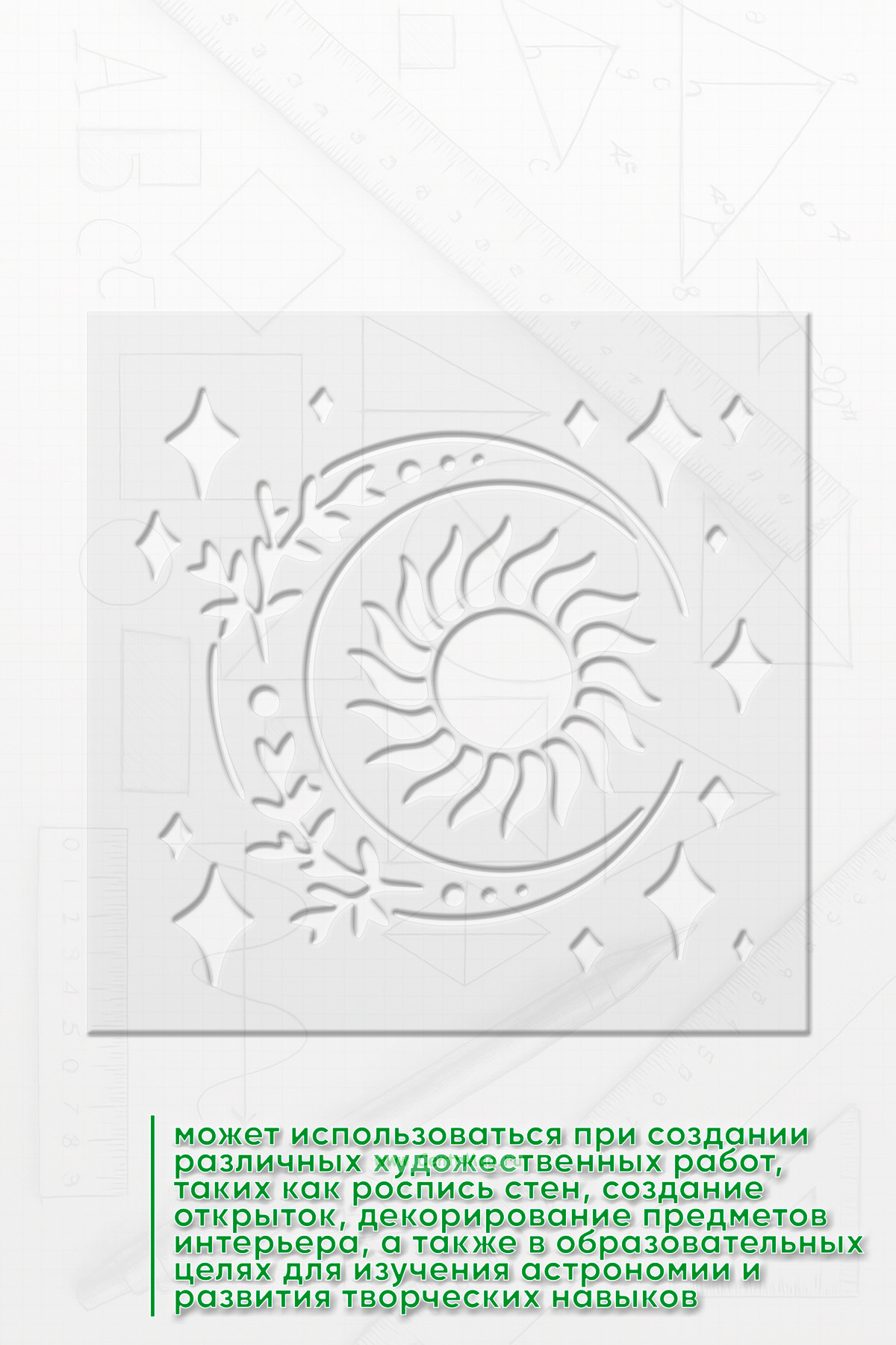 Трафарет "Солнце, Луна и звёзды" предназначен для декоративных и художественных целей. Он может использоваться при создании различных художественных работ, таких как роспись стен, создание открыток, декорирование предметов интерьера, а также в образовательных целях для изучения астрономии и развития творческих навыков. Такой трафарет помогает легко и аккуратно наносить изображения солнечного диска, луны и звёзд, создавая красивые и гармоничные композиции.