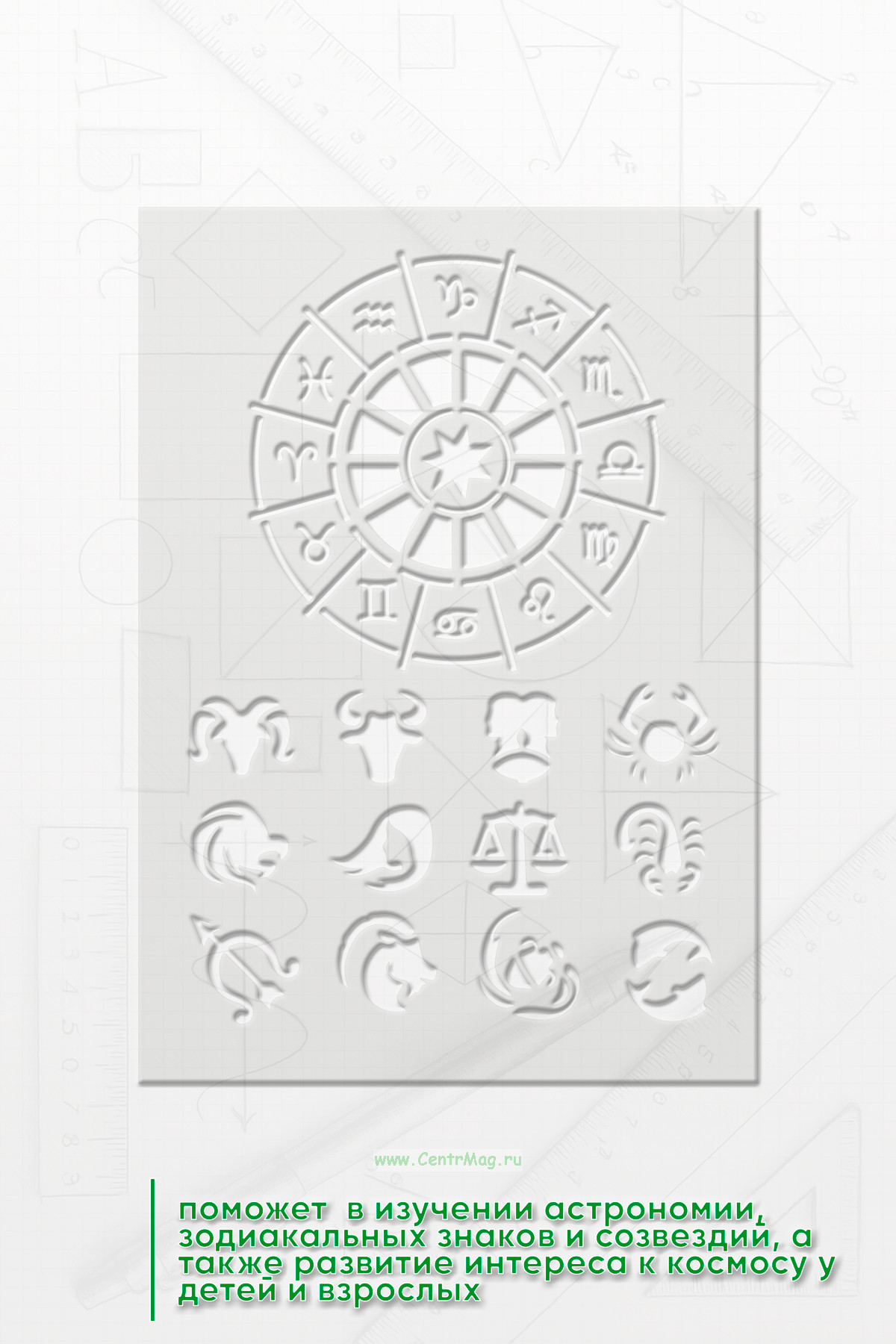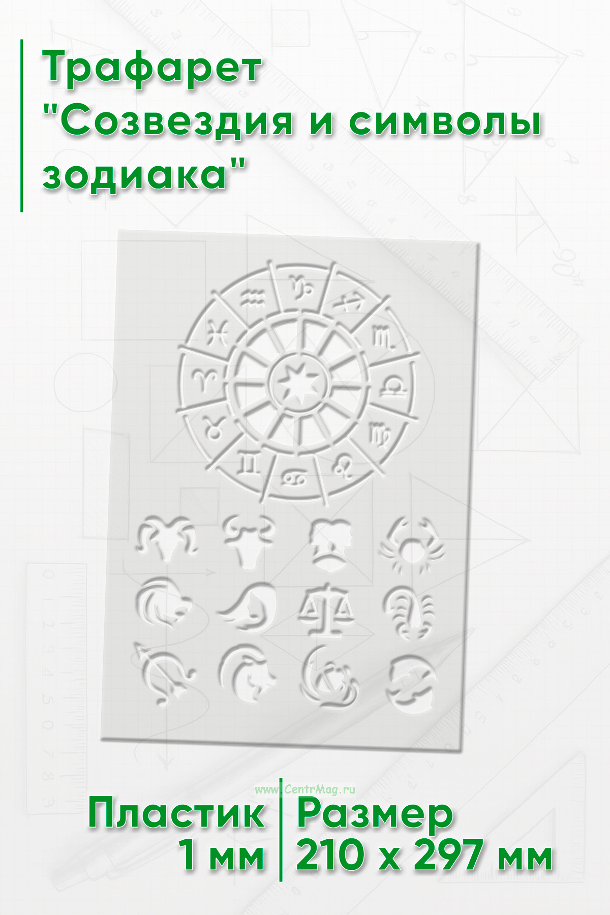 Трафарет "Созвездия и символы зодиака" помогут в изучении астрономии, зодиакальных знаков и созвездий, а также развитие интереса к космосу у детей и взрослых.