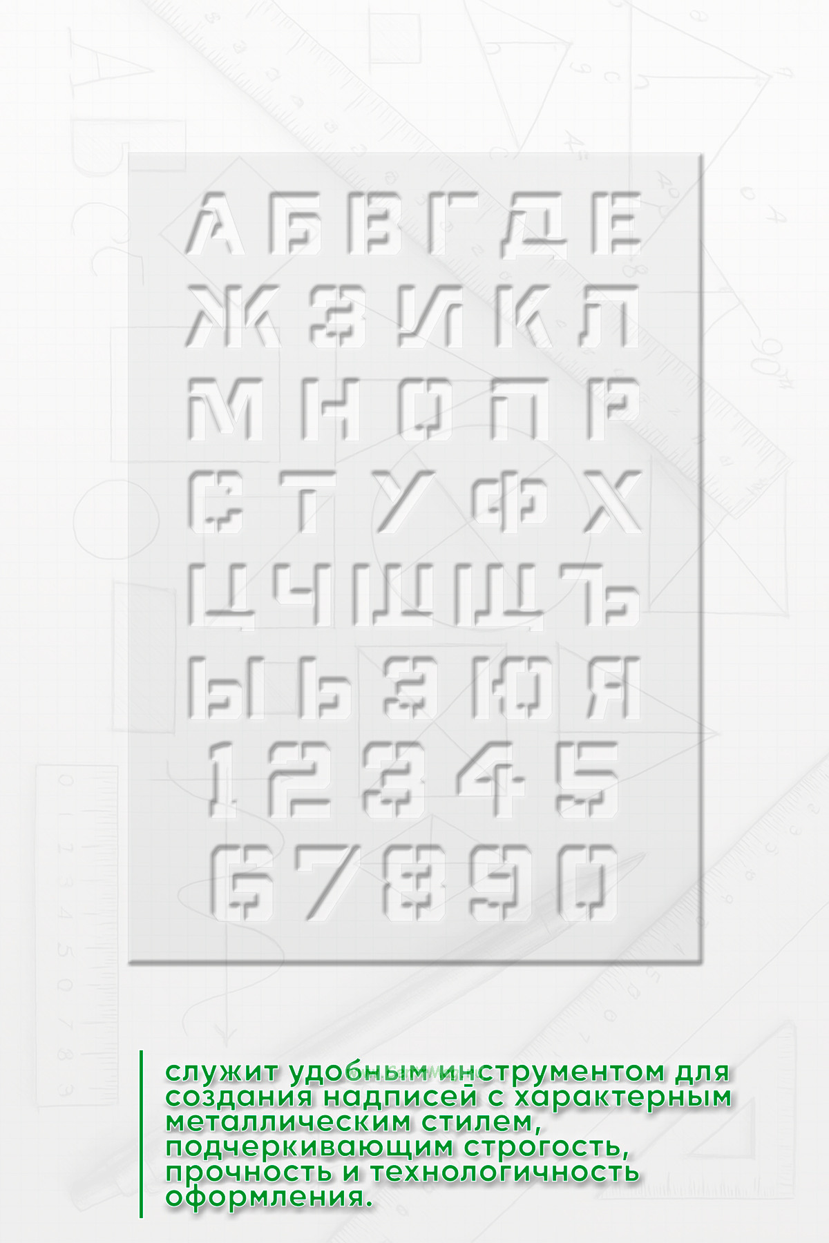 Трафарет «Стальной шрифт» служит удобным инструментом для создания надписей с характерным металлическим стилем, подчеркивающим строгость, прочность и технологичность оформления.