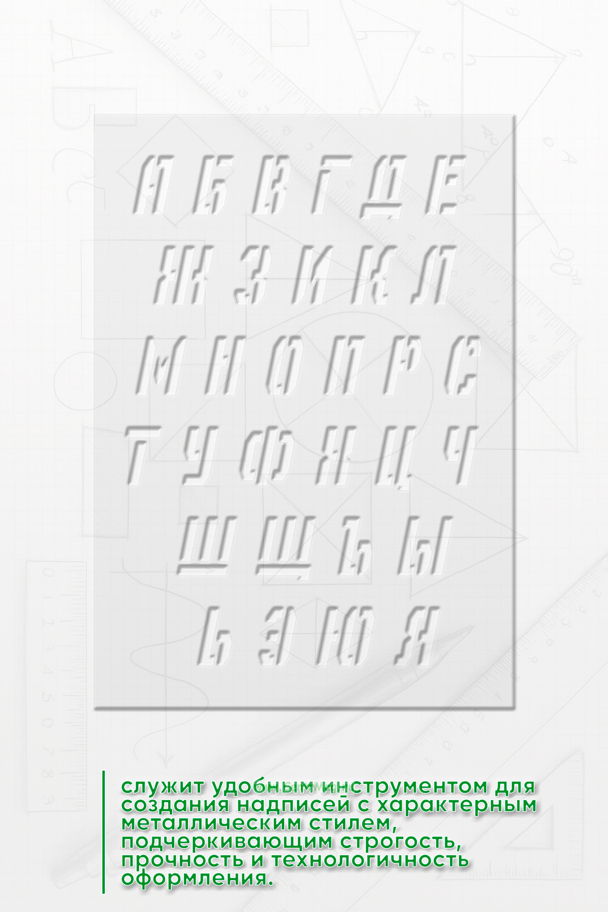 Трафарет «Стальной шрифт» служит удобным инструментом для создания надписей с характерным металлическим стилем, подчеркивающим строгость, прочность и технологичность оформления.