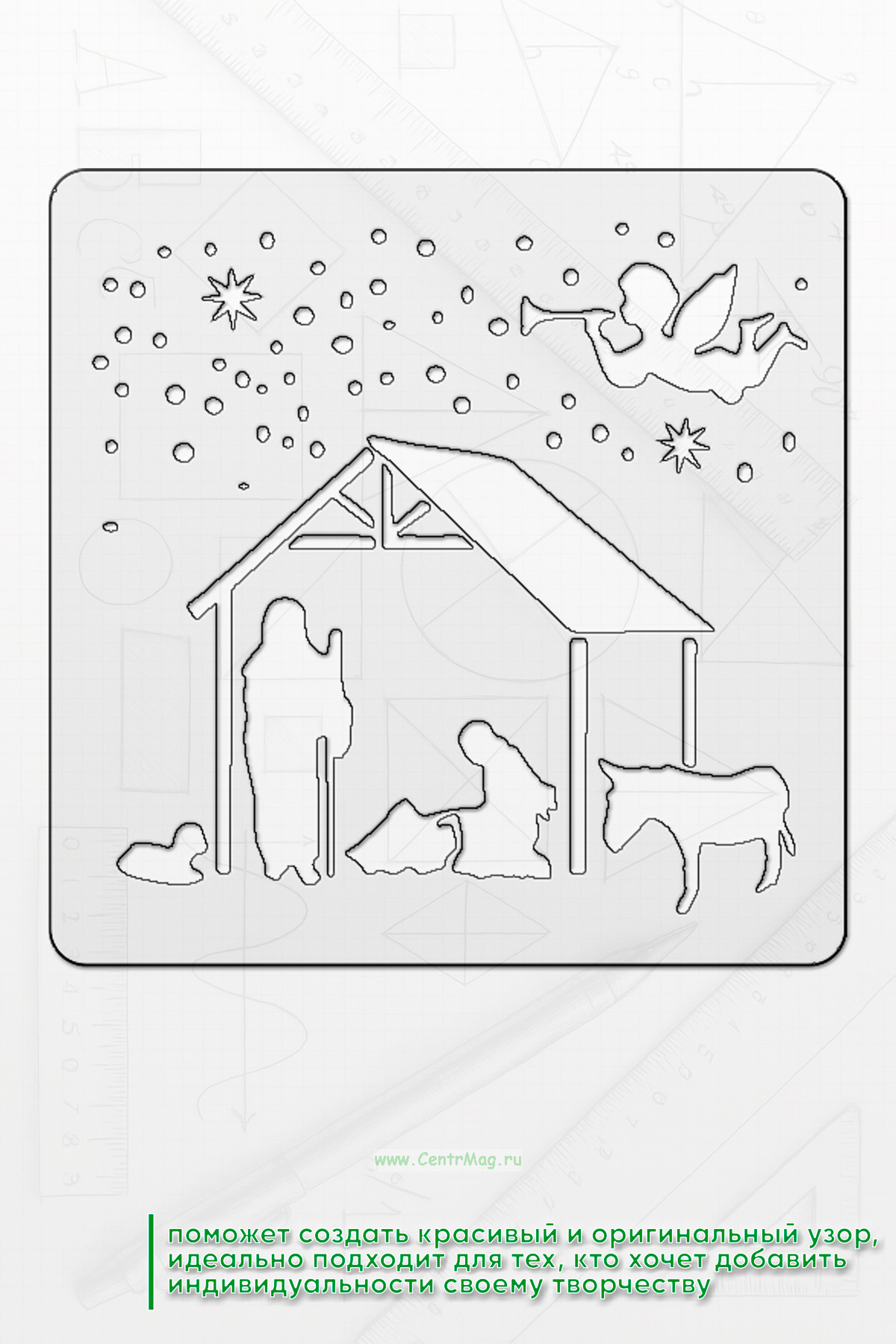 Трафарет поможет создать красивый и оригинальный узор. Идеально подходит для тех, кто хочет добавить индивидуальности своему творчеству в Новогодние праздники. Можно использовать для украшения открыток, альбомов, коробок, шкатулок, предметов мебели и даже интерьера