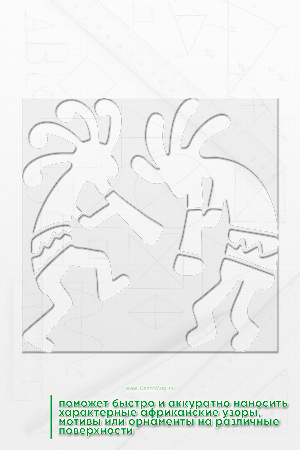Трафарет "Танец духов" обычно используется для создания декоративных узоров, рисунков или элементов в художественной, дизайнерской, или декоративной деятельности. Поможет быстро и аккуратно наносить характерные африканские узоры, мотивы или орнаменты на различные поверхности, такие как стены, ткани, бумага или другие материалы.