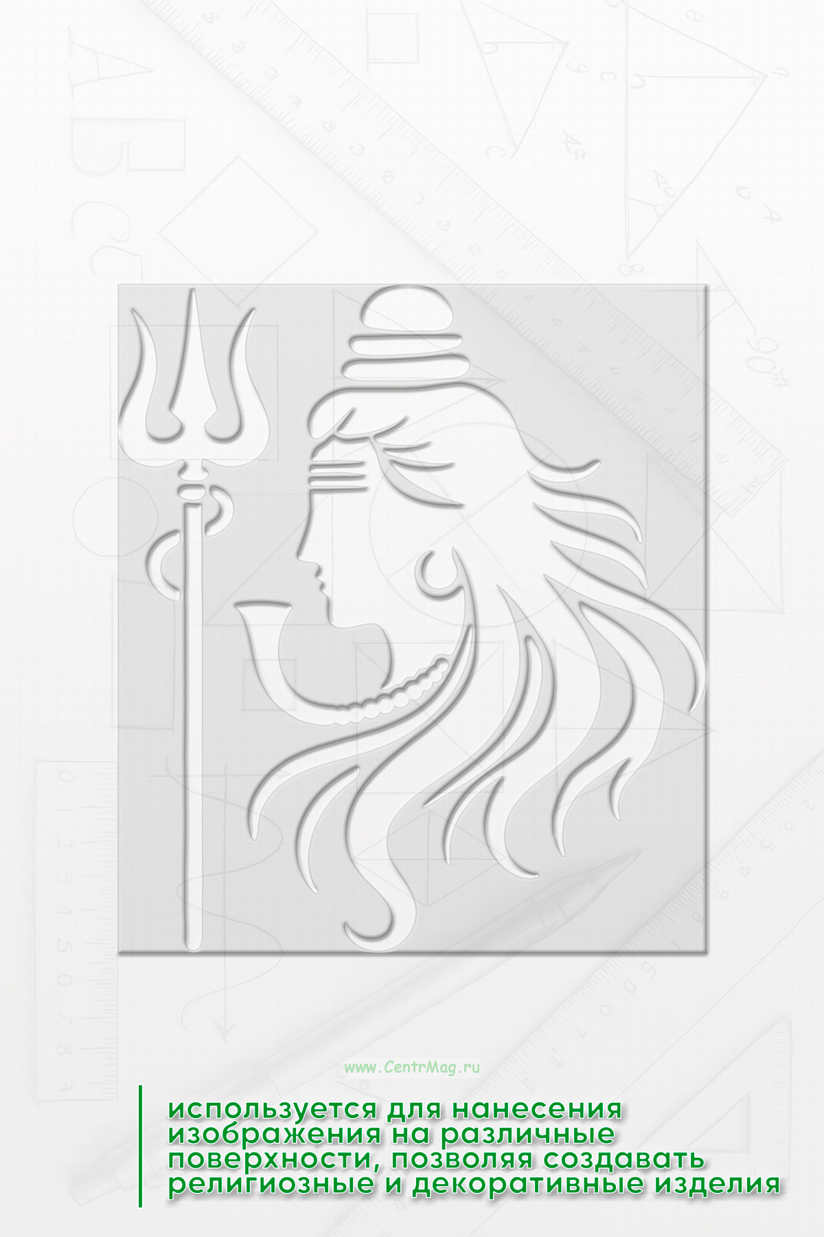 Трафарет "Тайна Шивы" используется для нанесения изображения бога Шивы на различные поверхности, позволяя создавать религиозные и декоративные изделия. Его предназначение — создание художественных или эзотерических украшений и предметов.