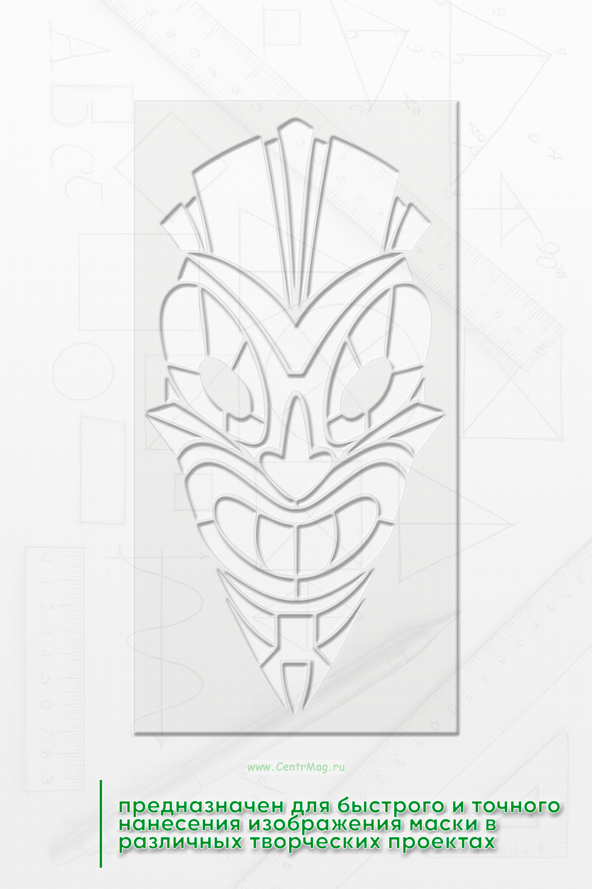Трафарет "Тайный хранитель" предназначен для быстрого и точного нанесения изображения маски в различных творческих проектах. Он помогает создать эффект аутентичной древней маски, подчеркивая стиль и атмосферу исторического или фантастического образа.