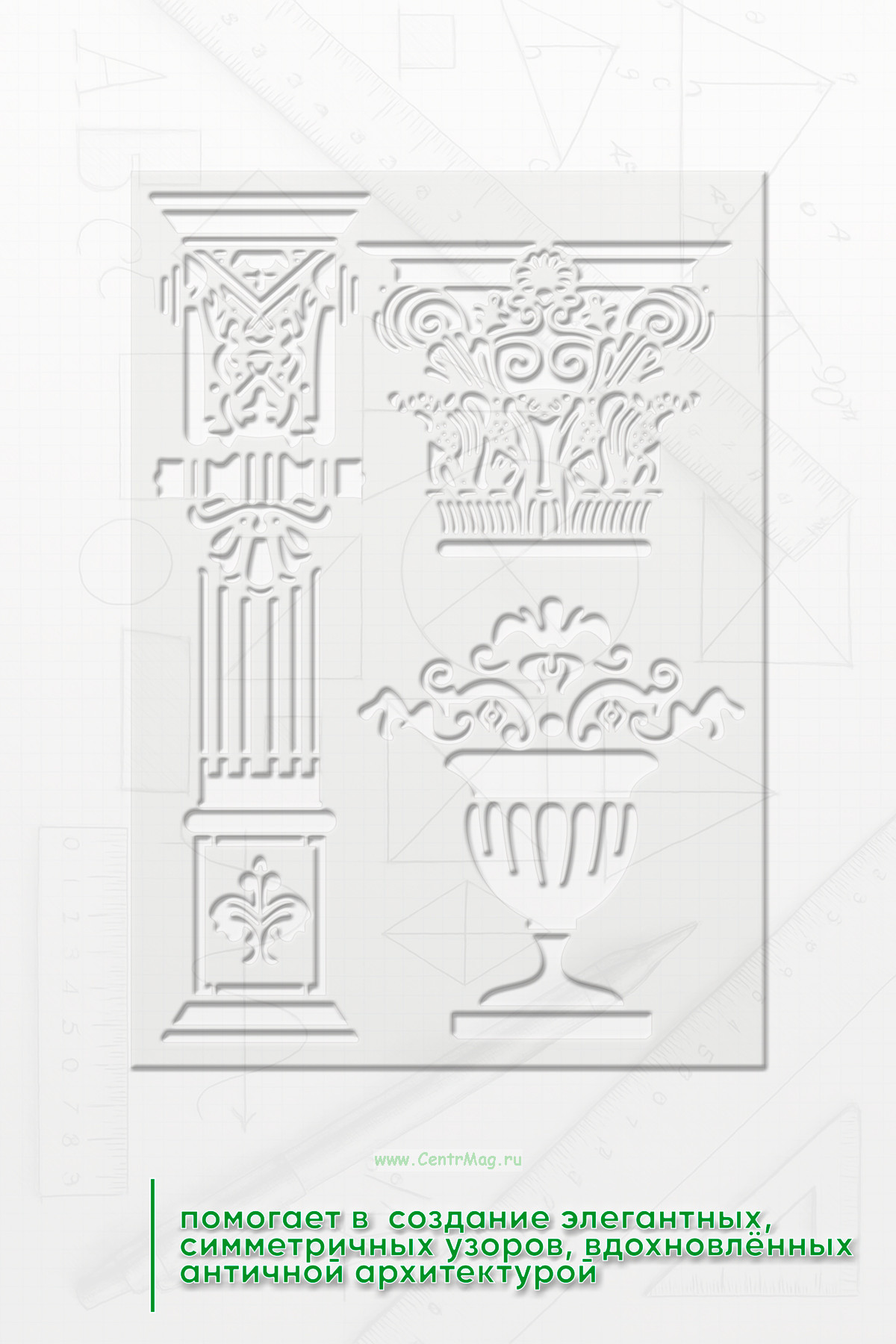 Трафарет "Тени Парфенона помогает в создание элегантных, симметричных узоров, вдохновлённых античной архитектурой.