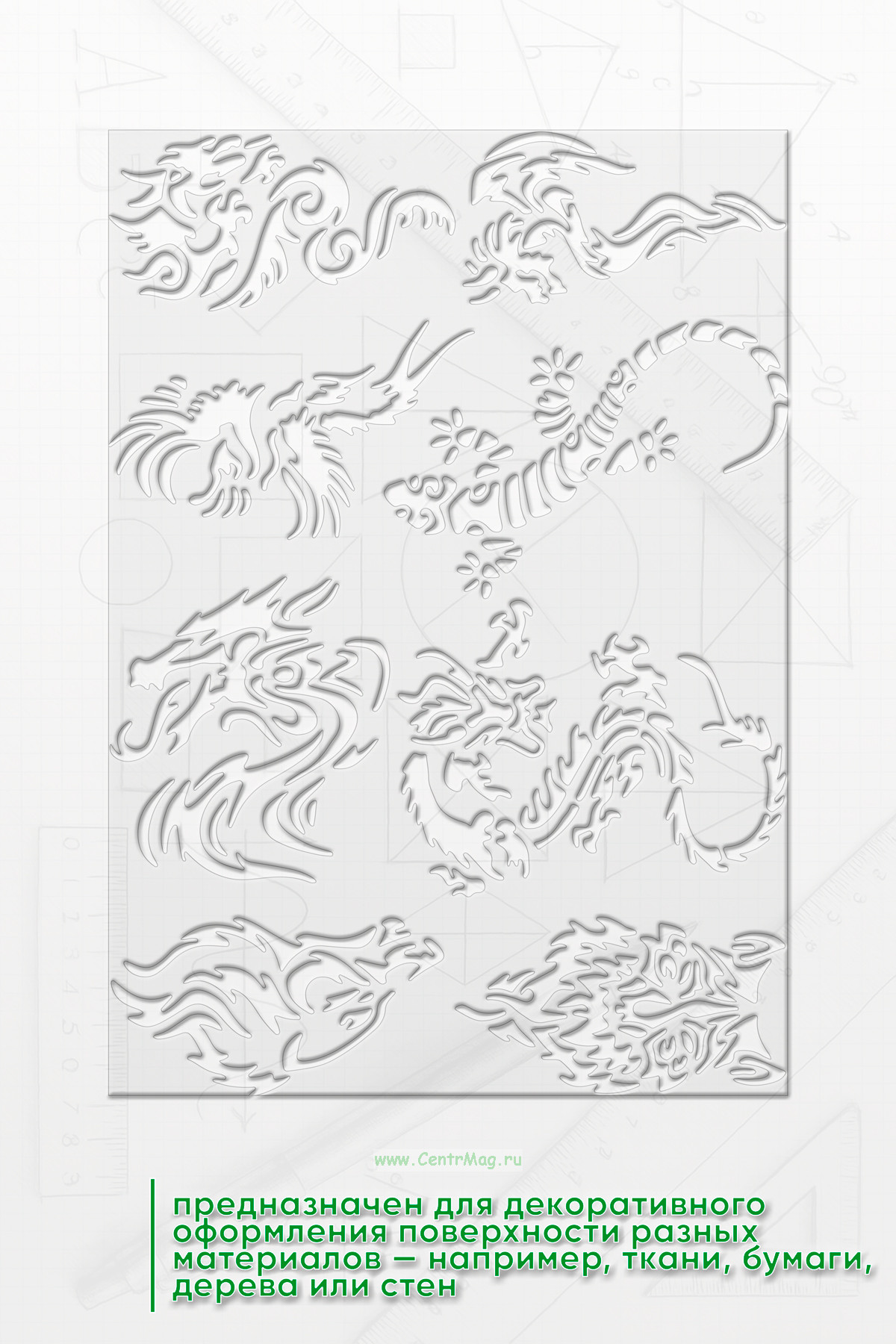 Трафарет "Трайбл: хищники, драконы, пауки и надписи" предназначен для декоративного оформления поверхности разных материалов — например, ткани, бумаги, дерева или стен.