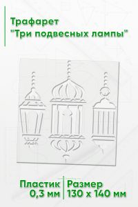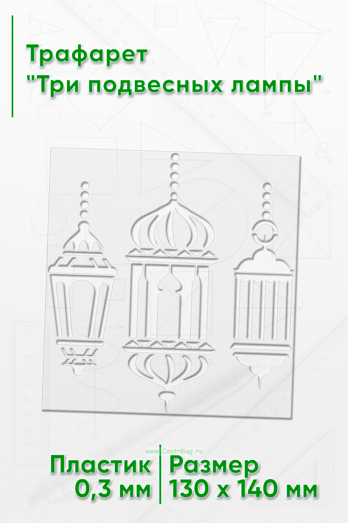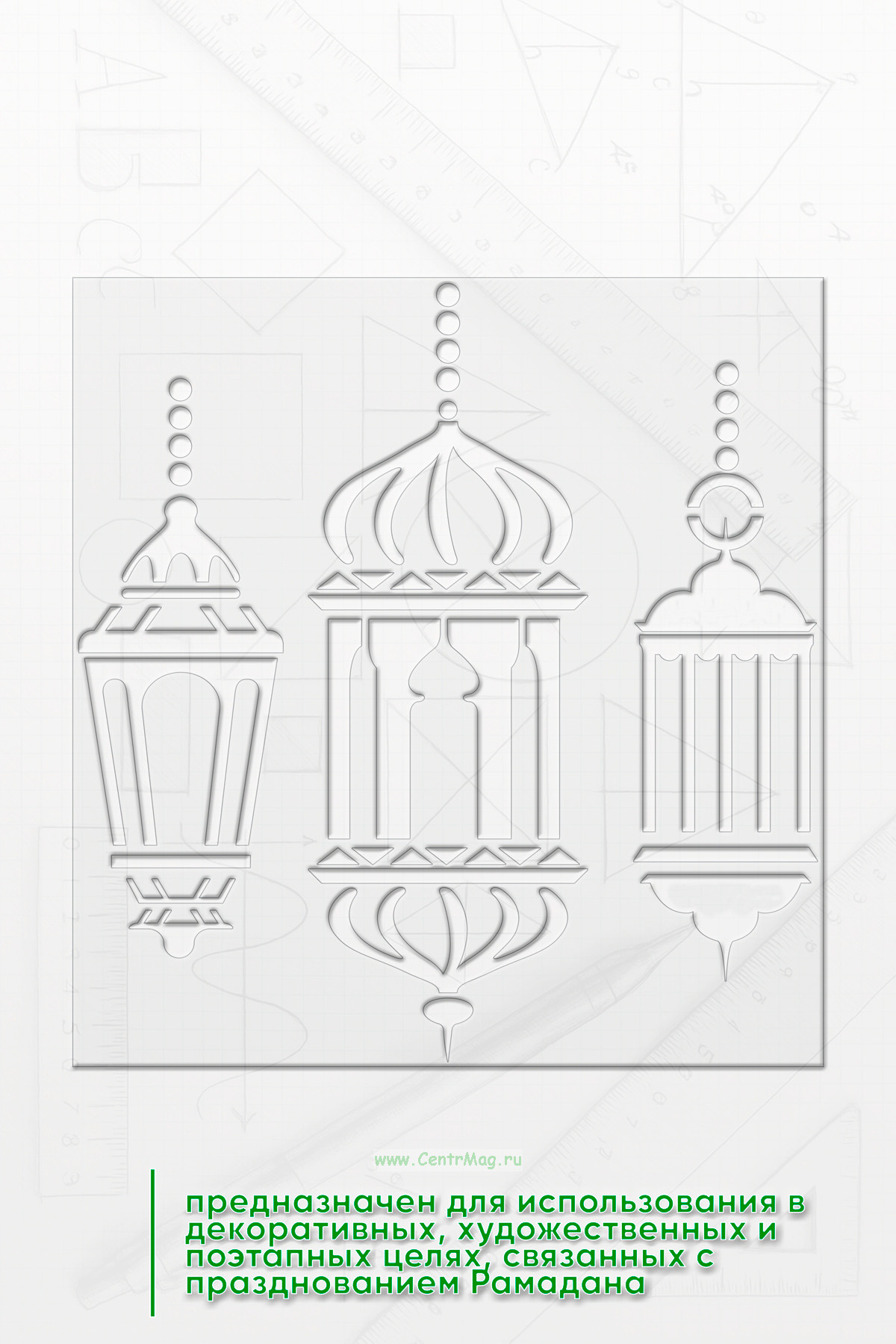 Трафарет "Три подвесных лампы" предназначен для использования в декоративных, художественных и поэтапных целях, связанных с празднованием Рамадана.