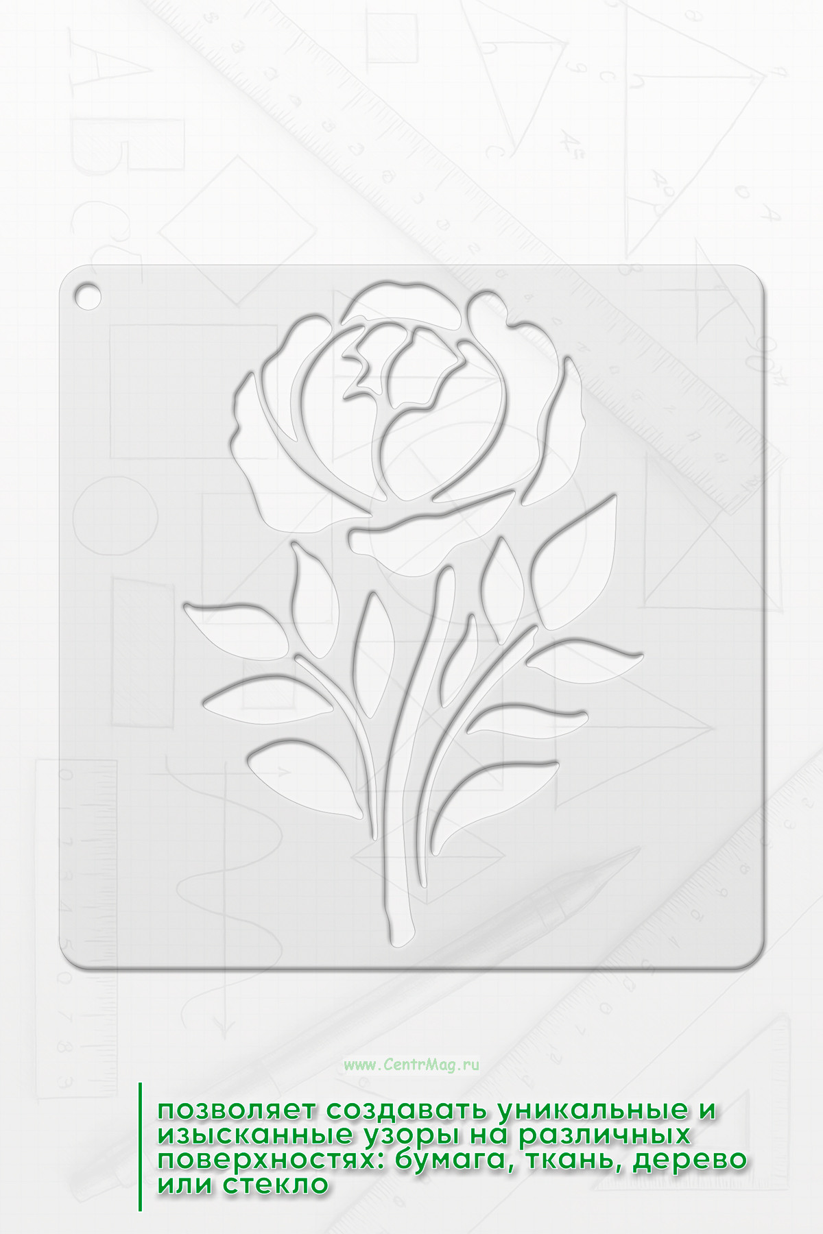 Трафарет - это отличный инструмент для творчества и декорирования. Трафарет позволяет создавать уникальные и изысканные узоры на различных поверхностях: бумага, ткань, дерево или стекло. Возможно использовать для оформления открыток, альбомов, для работы красками, спреями, чернилами