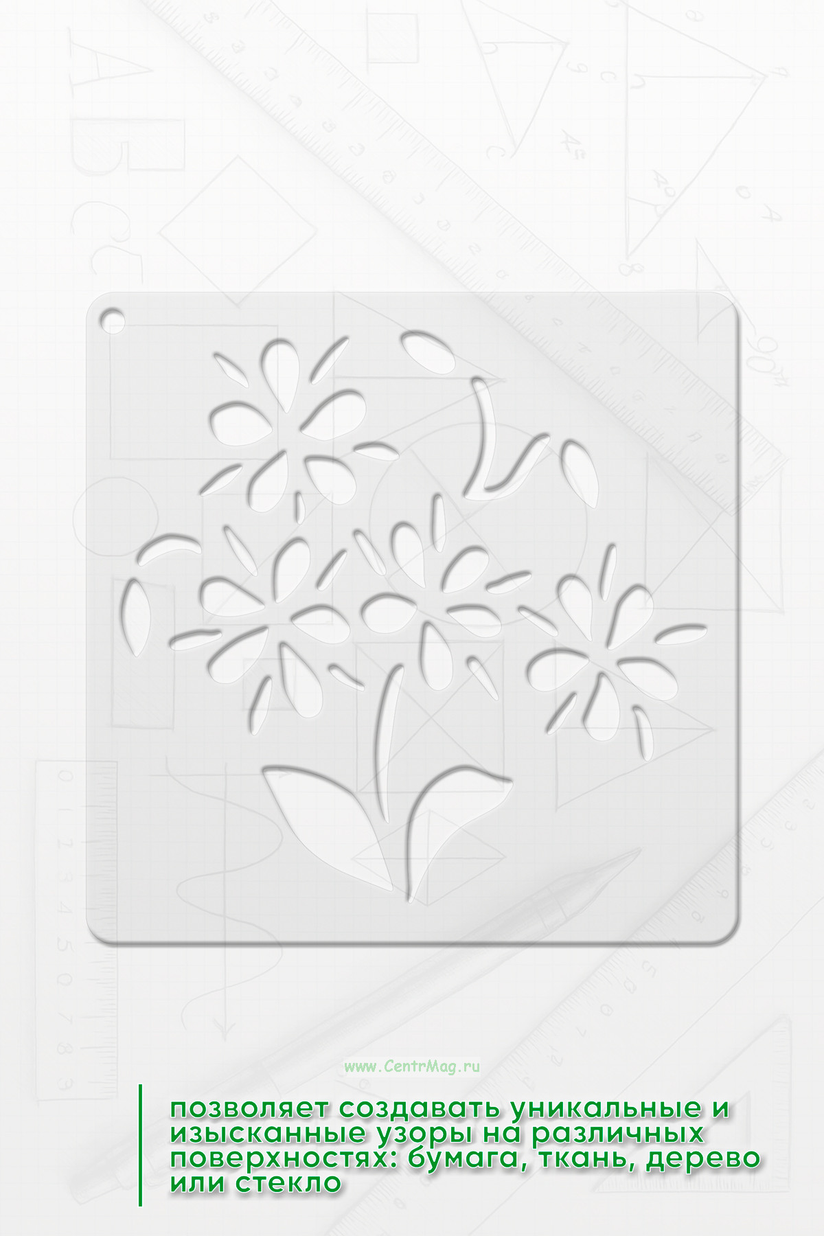 Трафарет - это отличный инструмент для творчества и декорирования. Трафарет позволяет создавать уникальные и изысканные узоры на различных поверхностях: бумага, ткань, дерево или стекло. Возможно использовать для оформления открыток, альбомов, для работы красками, спреями, чернилами