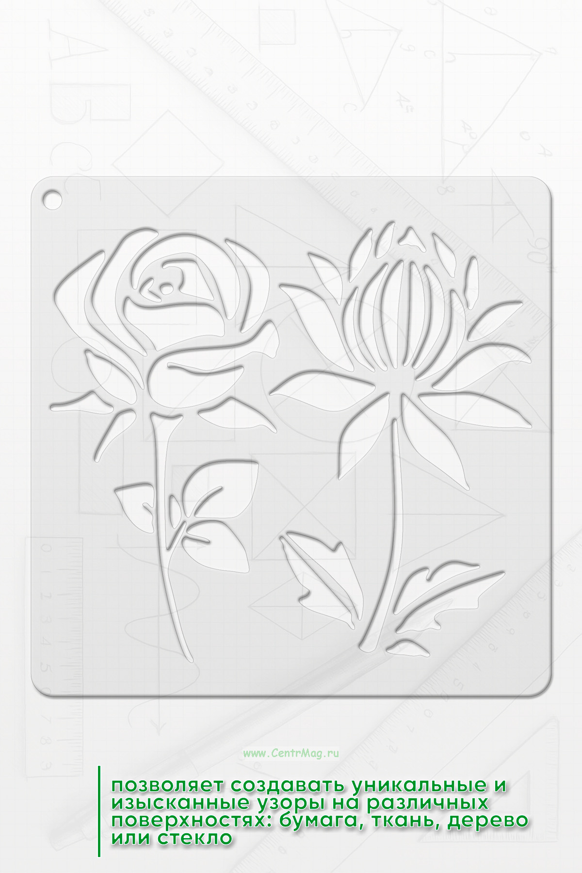 Трафарет - это отличный инструмент для творчества и декорирования. Трафарет позволяет создавать уникальные и изысканные узоры на различных поверхностях: бумага, ткань, дерево или стекло. Возможно использовать для оформления открыток, альбомов, для работы красками, спреями, чернилами
