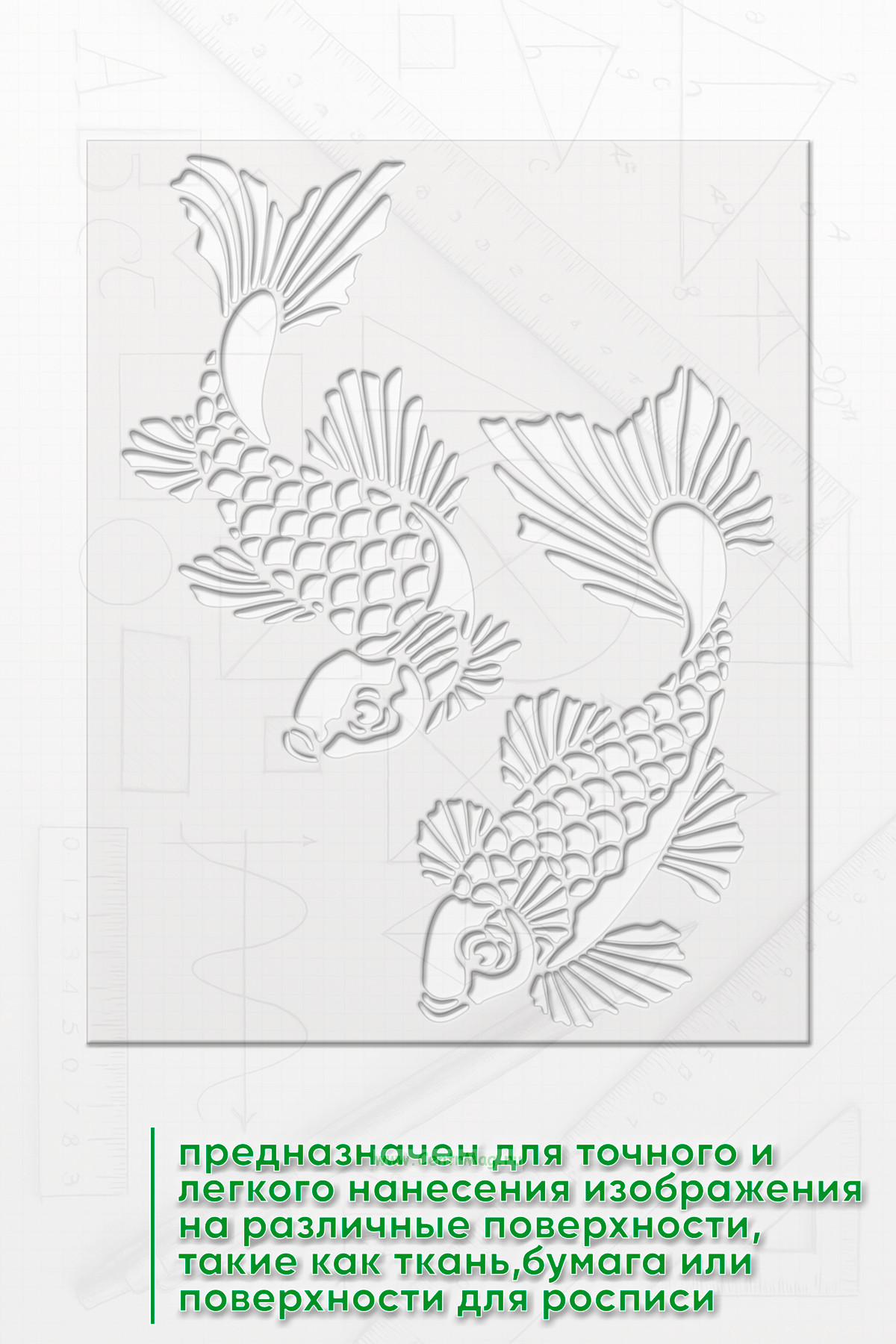 Трафарет предназначен для точного и легкого нанесения изображения на различные поверхности, такие как ткань,бумага или поверхности для росписи. Его используют в живописи, декоре и рукоделии для создания реалистичных и аккуратных изображений карпа кои.