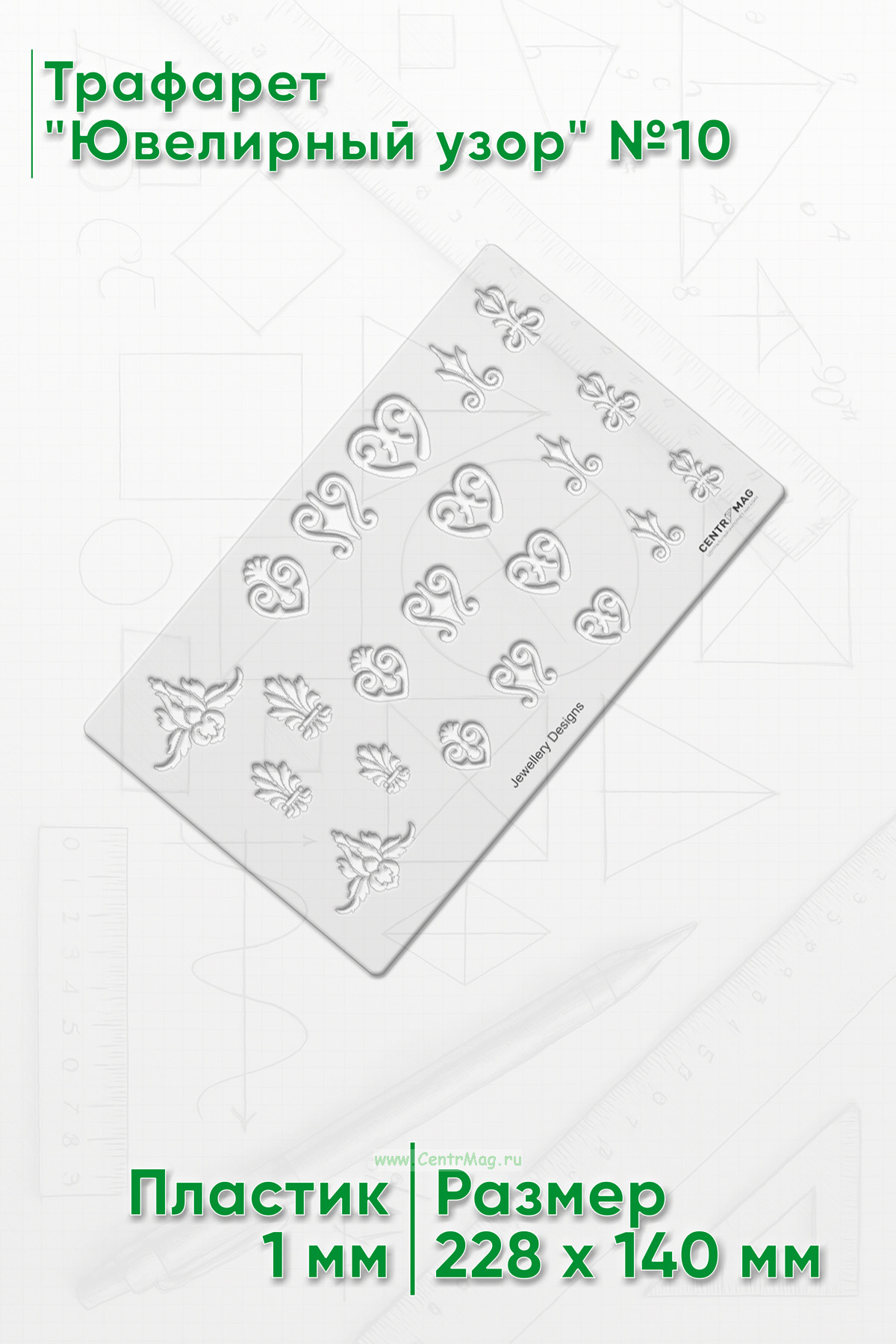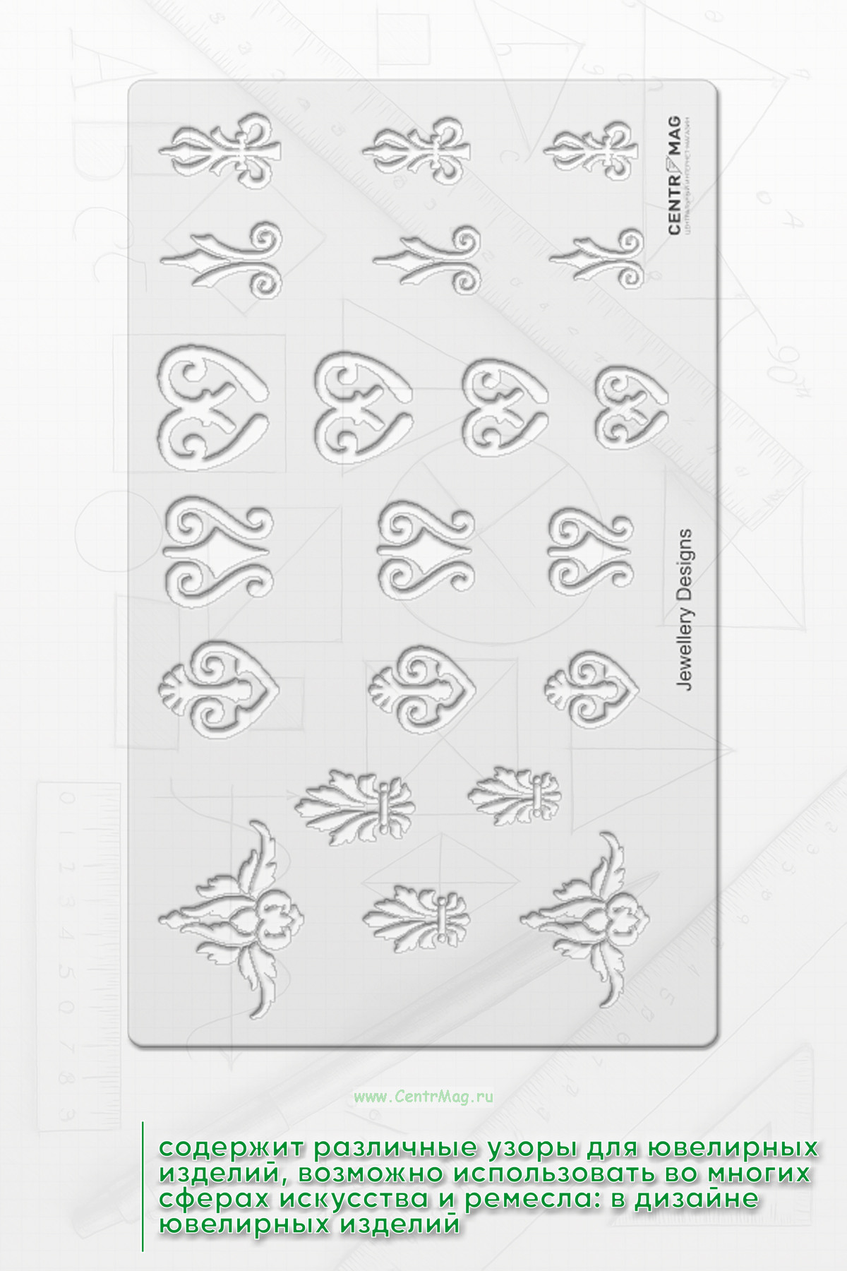 Трафарет содержит различные узоры для ювелирных изделий. Возможно использовать во многих сферах искусства и ремесла: в дизайне ювелирных изделий, иллюстраций и открыток, а также для рисования фигур на различных поверхностях.