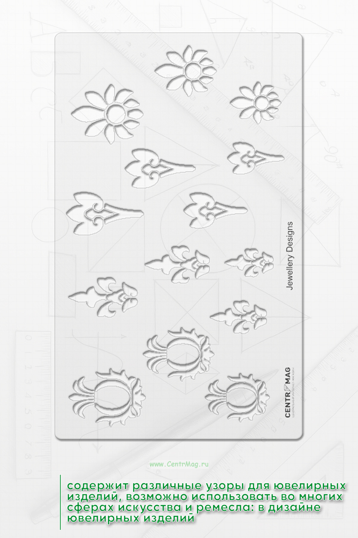 Трафарет содержит различные узоры для ювелирных изделий. Возможно использовать во многих сферах искусства и ремесла: в дизайне ювелирных изделий, иллюстраций и открыток, а также для рисования фигур на различных поверхностях.