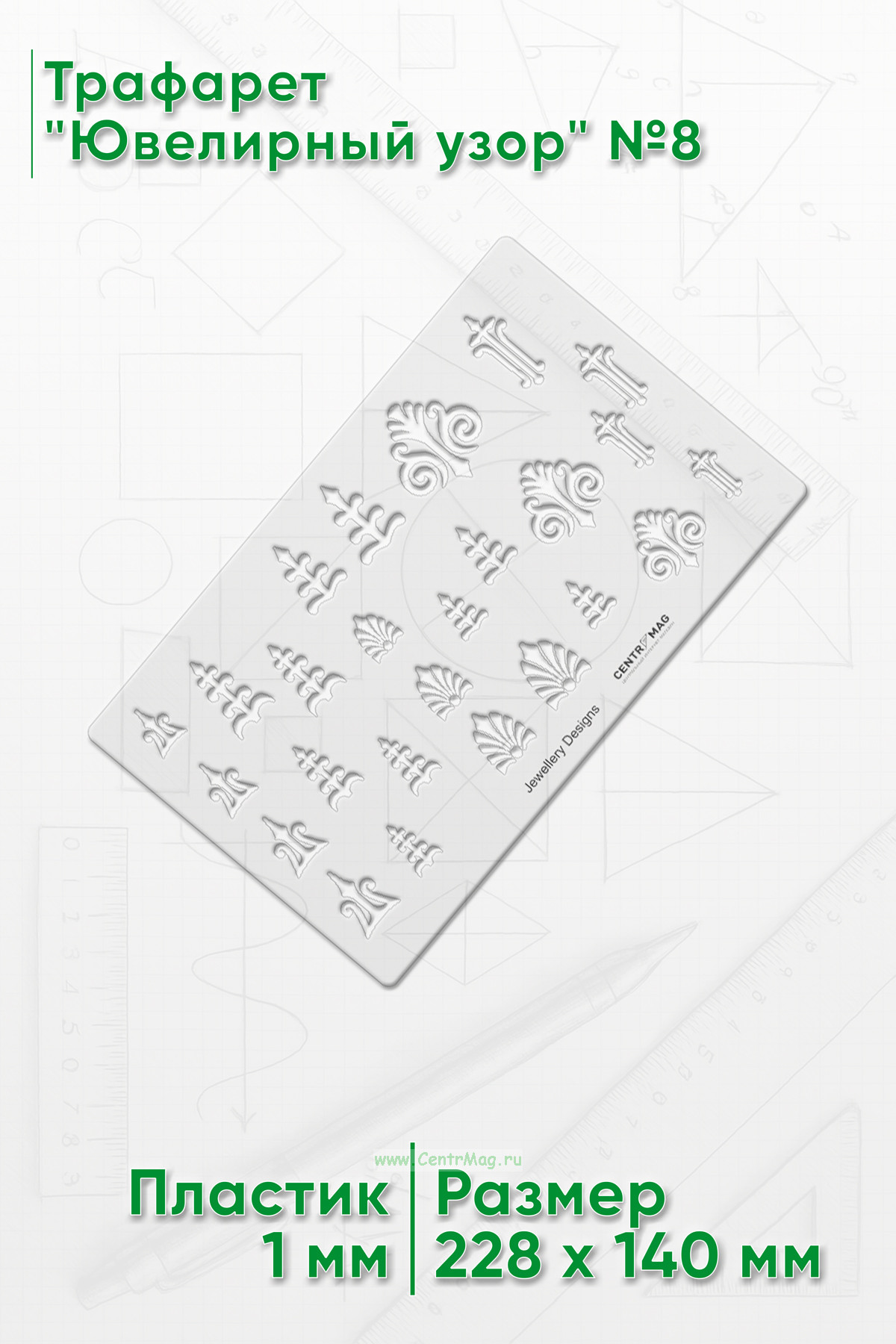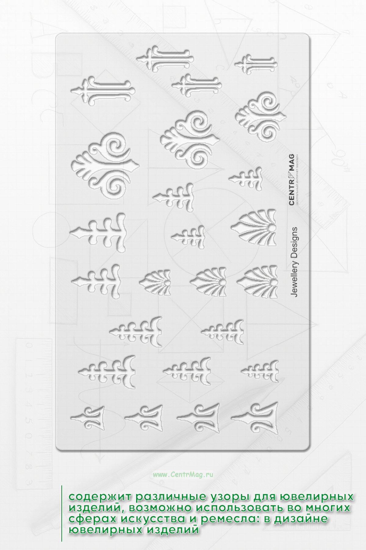 Трафарет содержит различные узоры для ювелирных изделий. Возможно использовать во многих сферах искусства и ремесла: в дизайне ювелирных изделий, иллюстраций и открыток, а также для рисования фигур на различных поверхностях.