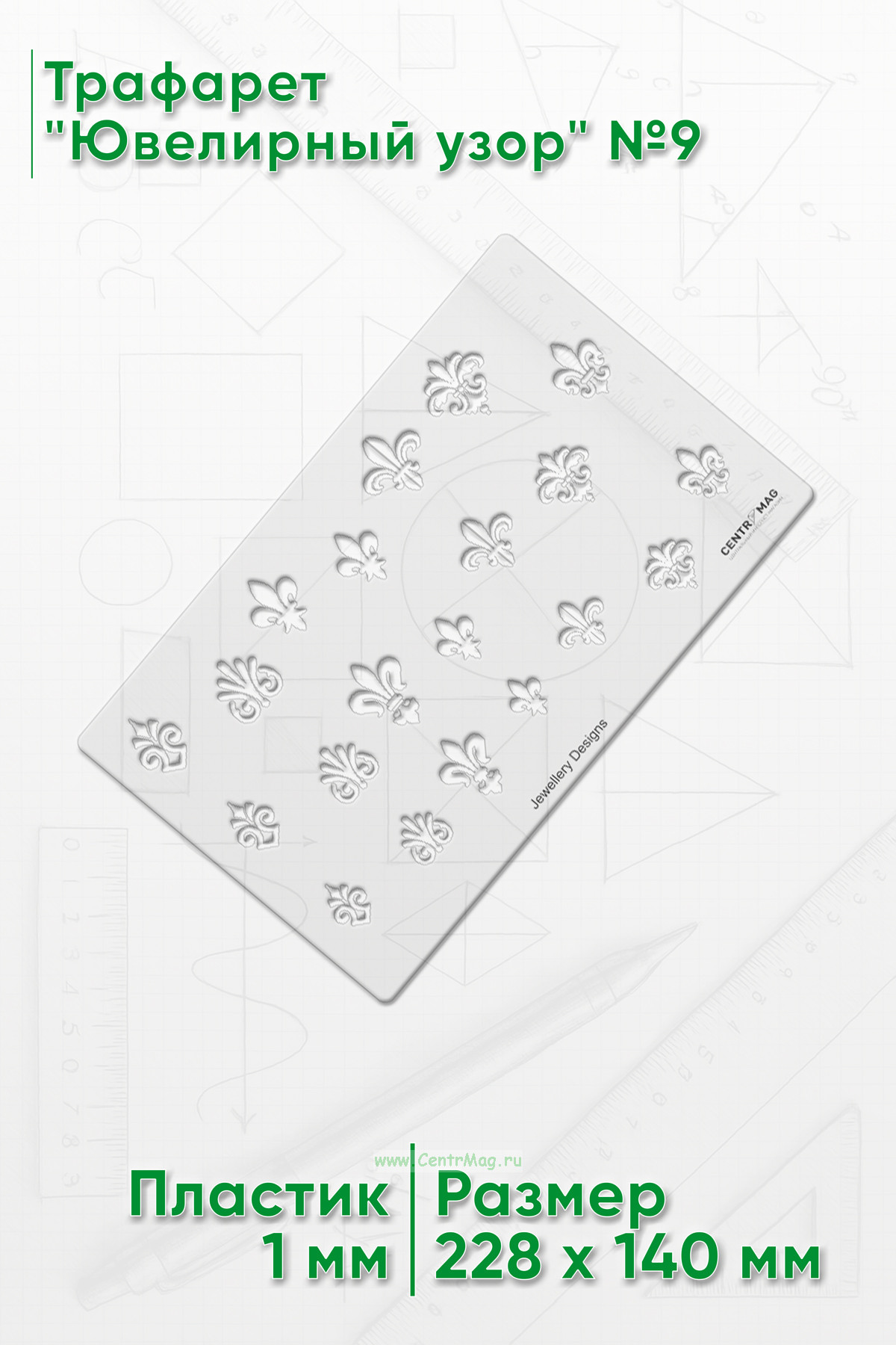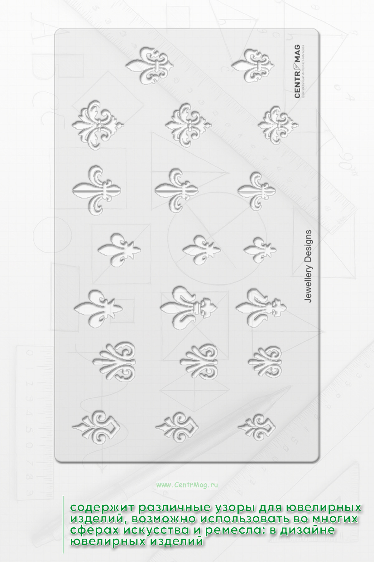 Трафарет содержит различные узоры для ювелирных изделий. Возможно использовать во многих сферах искусства и ремесла: в дизайне ювелирных изделий, иллюстраций и открыток, а также для рисования фигур на различных поверхностях.