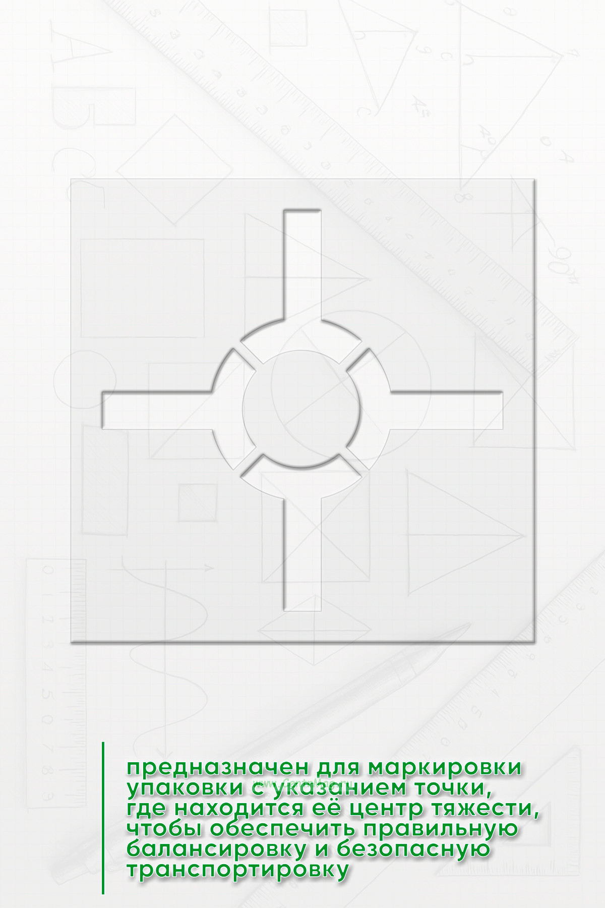 Трафарет Знак для упаковки "Центр тяжести" предназначен для маркировки упаковки с указанием точки, где находится её центр тяжести, чтобы обеспечить правильную балансировку и безопасную транспортировку. Он помогает повысить безопасность при погрузке, разгрузке и хранении грузов.
