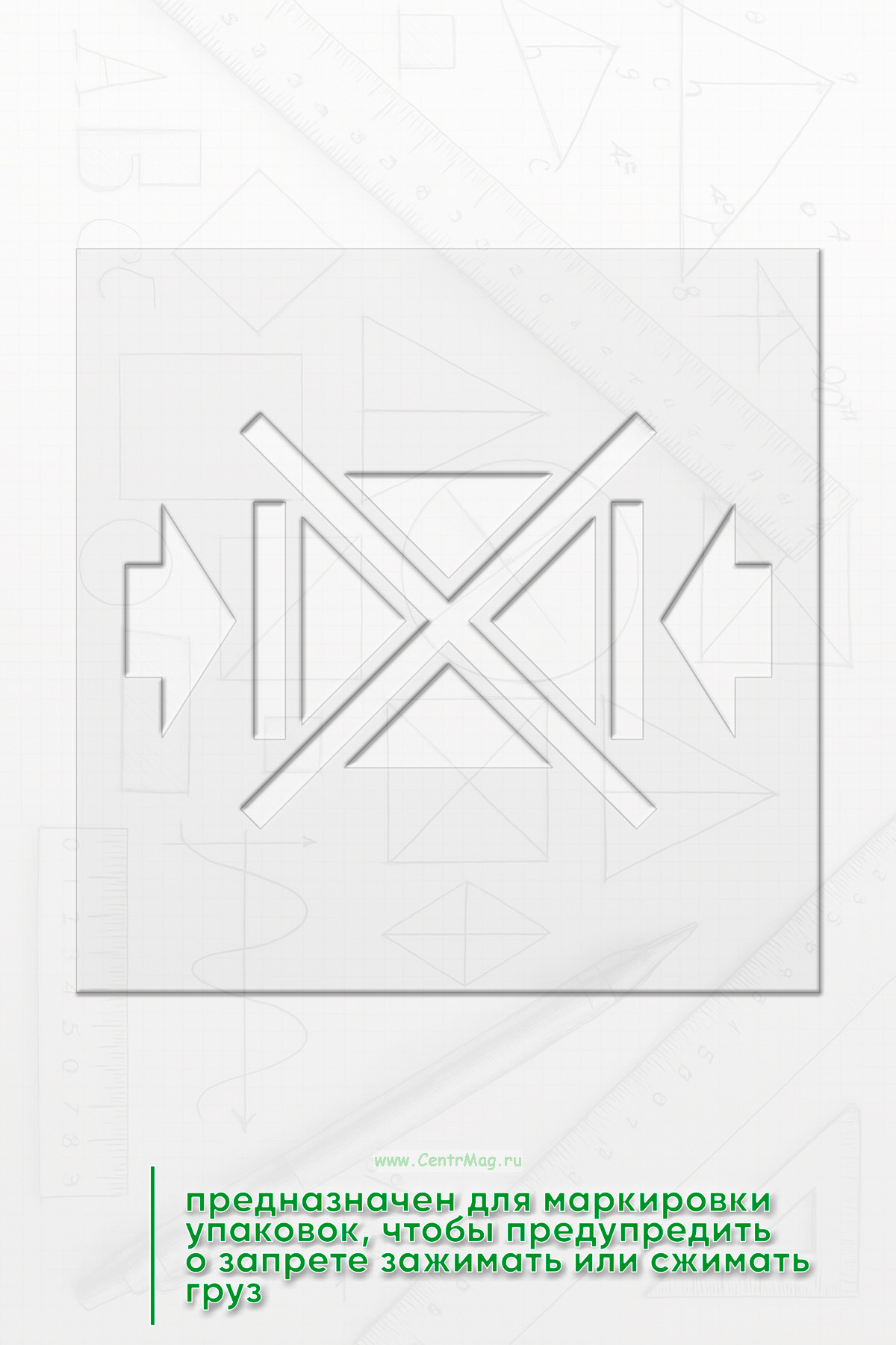 Трафарет Знак для упаковки "Не зажимать" предназначен для маркировки упаковок, чтобы предупредить о запрете зажимать или сжимать груз. Он помогает предотвратить повреждения и обеспечить безопасность при обращении с товаром.
