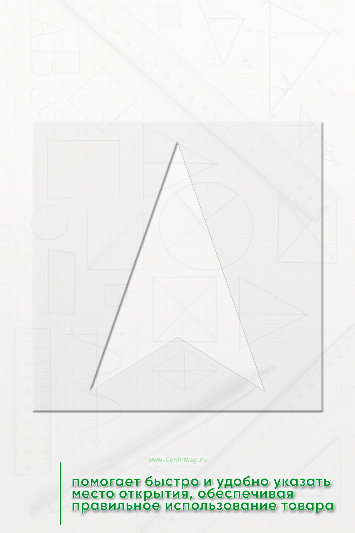 Трафарет Знак для упаковки "Открывать здесь" предназначен для нанесения яркой и четкой инструкции на упаковки или коробки. Он помогает быстро и удобно указать место открытия, обеспечивая правильное использование товара.