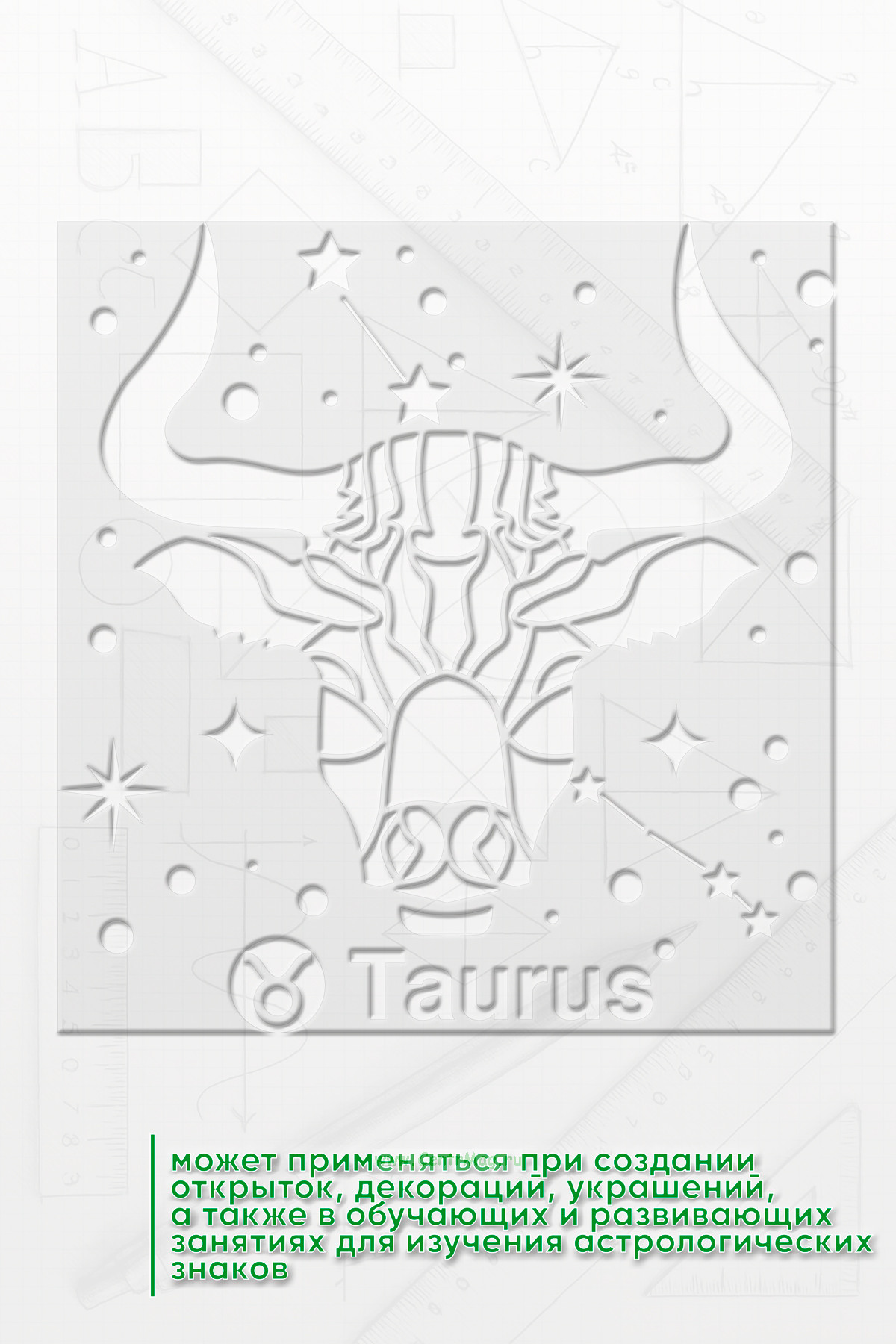 Трафарет "Знаки зодиака Taurus" предназначен для использования в декоративных и художественных работах. Он позволяет легко и точно наносить изображения знаков зодиака на различные поверхности, такие как бумага, ткань, стены или другие материалы. Такой трафарет может применяться при создании открыток, декораций, украшений, а также в обучающих и развивающих занятиях для изучения астрологических знаков.